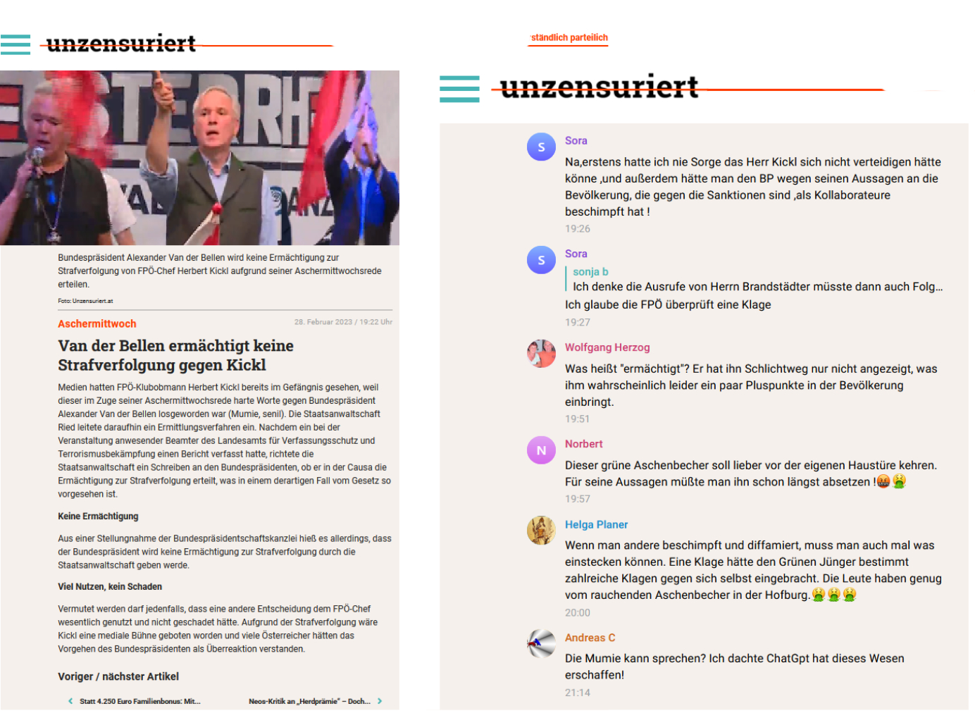 Das ist zu lesen am 28. Februar ’23 auf der gesinnungsgemäß zensurierten Website. Es wird „Mumie, senil“ in Klammern gesetzt, aber ohne Anführungszeichen, das heißt, es wird nicht Herbert Kickl zitiert, sondern es wird von diesen Machenden dieser Website selbst Bundespräsident Alexander Van der Bellen als „Mumie, senil“ bezeichnet, einfallslos verwenden sie die gleichen Worte wie ihr Festungskommandant. „Mumie, senil“ als „harte Worte“ einzustufen, heißt, eine Beschimpfung recht gutzuheißen, „Mumie, senil“ nicht in Anführungszeichen als Zitat wiederzugeben, heißt, einfach wie kurz gesagt, zu beschimpfen, zu diffamieren, zu denunzieren.