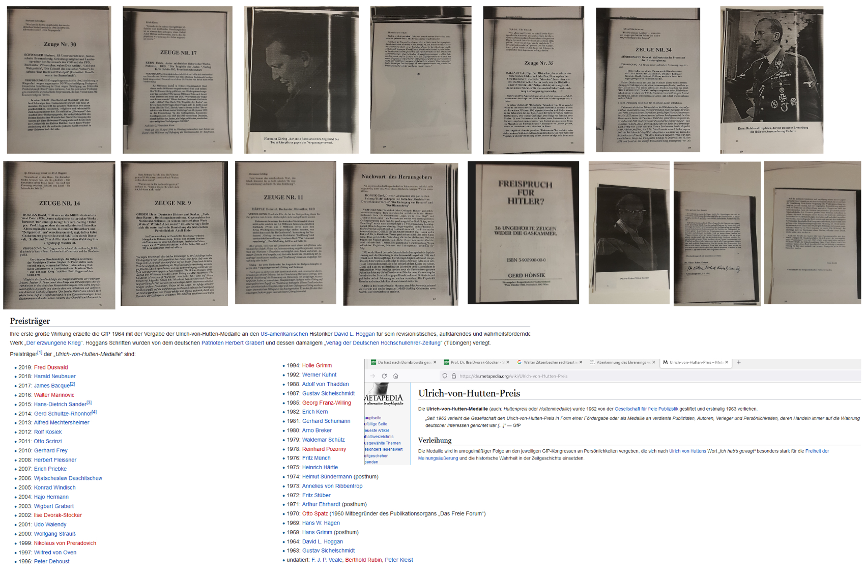 Konrad Windisch — ein „enger Weggefährte Herbert Schweigers“, wie die sich selbst nennende alternative Enzyklopädie schreibt, und mit ihm ist noch von einem Mann zu sprechen, der starb, ohne die Huttenmedaille bekommen zu haben, obgleich er so viel tat für die „Freiheit der Meinungsäußerung und die historische Wahrheit in der Zeitgeschichte“ — Er ließ Preisträger zu Wort kommen in seinem vom burgenländischen Kulturverband unter dem Vorsitzenden Hans Strobl herausgebenen Buch, als Zeugen: Heinrich Härtle, Hans Grimm, David Hoggan, Helmut Sündermann, Erich Kern, Udo Walendy …