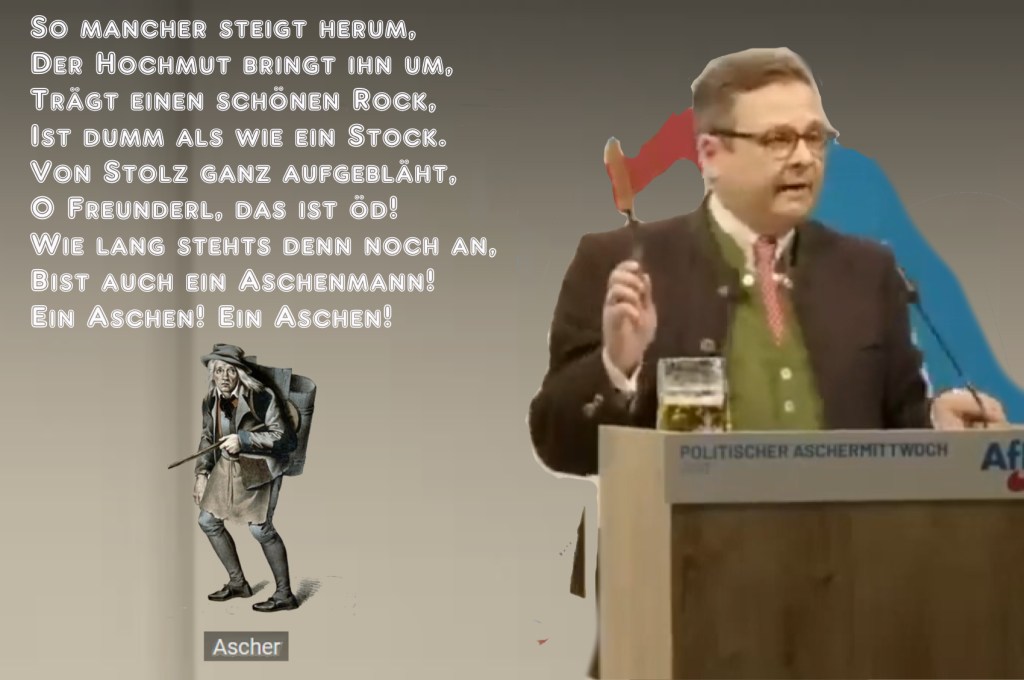 Am Tag der Asche, im Februar ’23, spricht Gerald Grosz in Bayern auf Einladung der AfD, etwa siebenundvierzig Minuten lang, und was er redet, was er so daherredet, nun, Sie können es Inhalt nennen; es ist ein Inhalt, auf den einzugehen, überflüssig ist, überflüssig auch, richtigzustellen, was er von sich gibt, überflüssig auch, seine Beleidigungen, seine Beschimpfungen, seine Verächtlichmachungen, seine Verballhornungen der Namen, etwa den von der Außenministerin in Deutschland, womit er zugleich auch eine Erniedrigung der Frau als Frau …