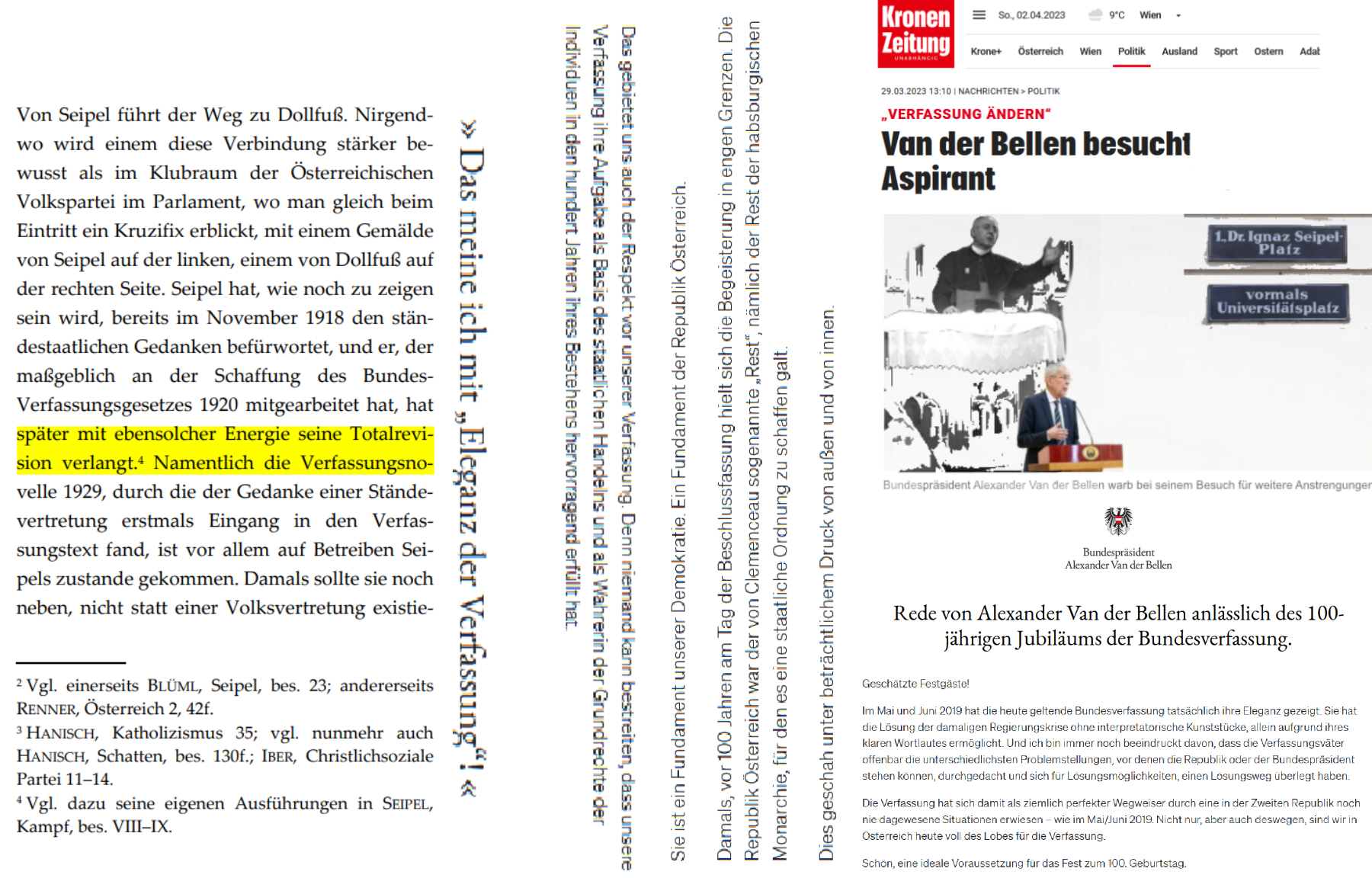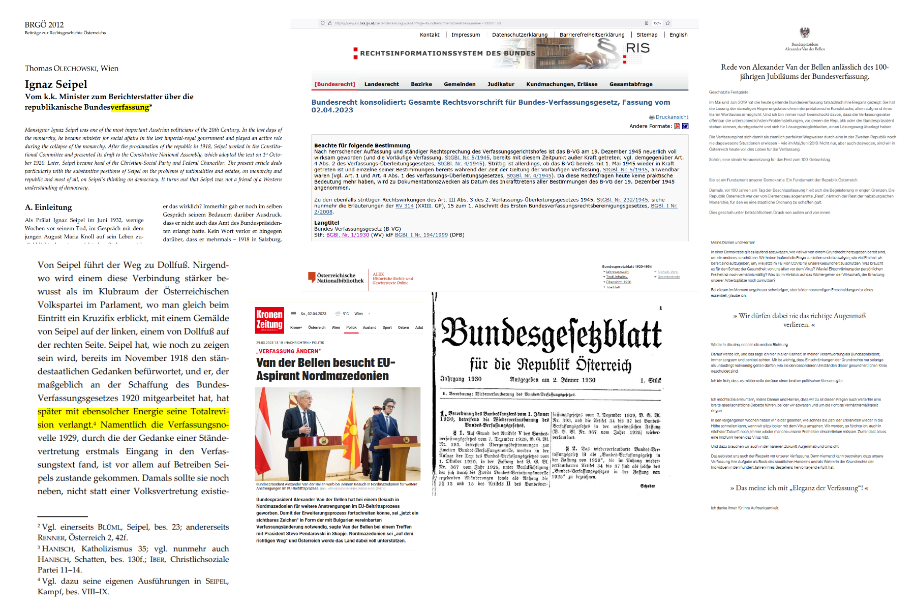 NNS Wie schnell Verhältnisse sich ändern können, wie schnell Menschen sich ändern können, vielleicht auch nur in ihrem nach Außen gezeigten Handeln, und das nicht unbedingt stets, wie es so schön heißt, zum Guten hin, das kann auch an Ignaz Seipel studiert werden, der maßgeblich an der Schaffung des Bundes-Verfassungsgesetzes 1920 mitgearbeitet hat, hat später, gerade einmal zehn Jahre später, mit ebensolcher Energie seine Totalrevision verlangt. Namentlich die Verfassungsnovelle 1929 …