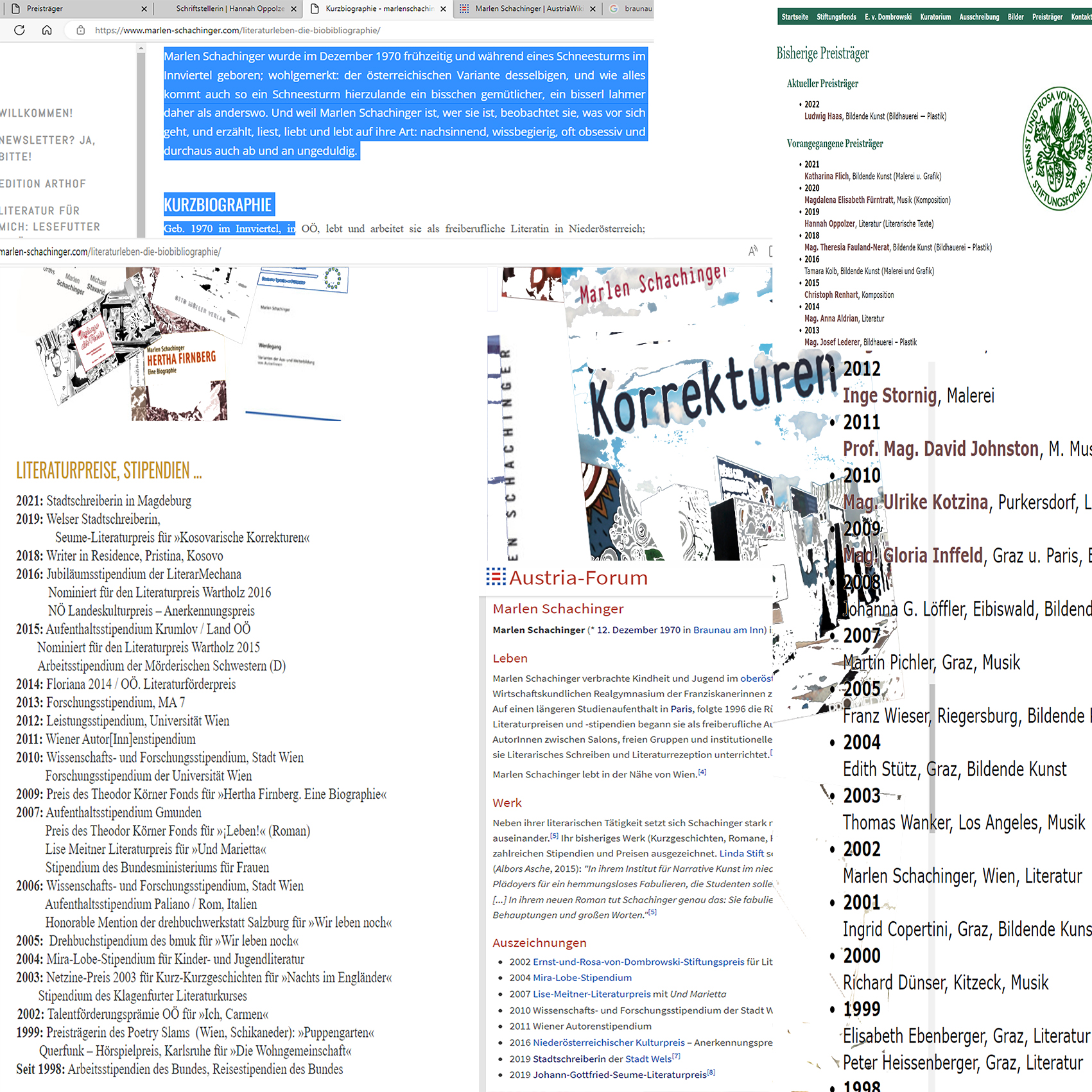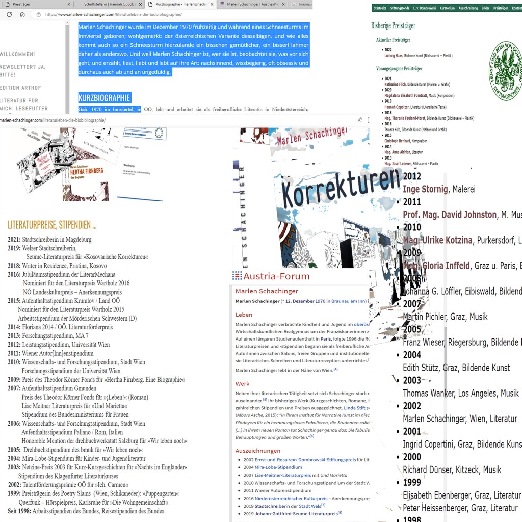 Es wird in Österreich nun welche geben, die sich grämen, daß Marlen Schachinger ihren ihr verliehenen Preis nicht mehr für würdig befindet, diesen ihren in ihrer Liste ihrer „Literaturpreise“, Stipendien …“ zu führen, wie am 12. April 2023 auf ihrer Website zu lesen ist.