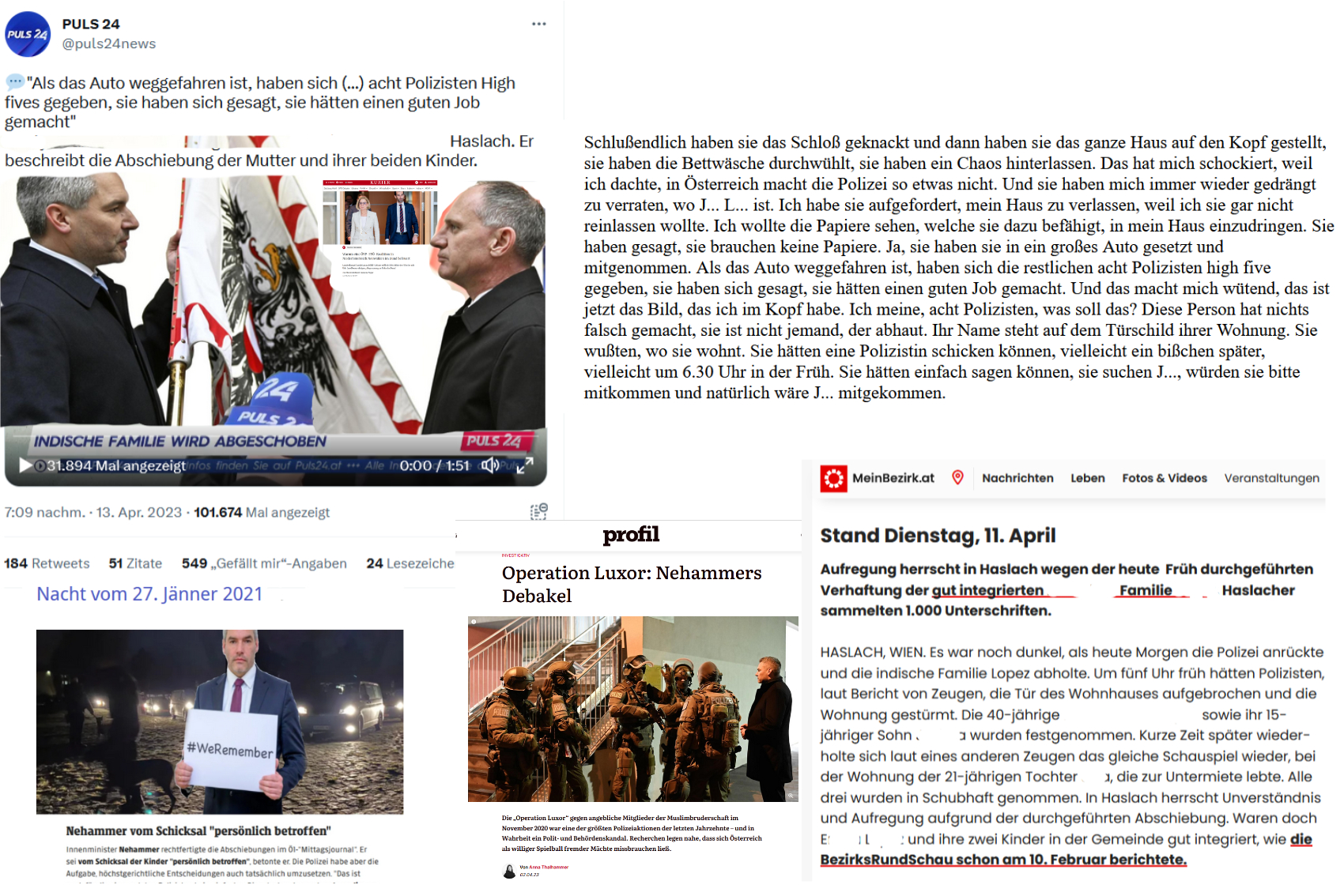 Schlußendlich haben sie das Schloß geknackt und dann haben sie das ganze Haus auf den Kopf gestellt, sie haben die Bettwäsche durchwühlt, sie haben ein Chaos hinterlassen. Das hat mich schockiert, weil ich dachte, in Österreich macht die Polizei so etwas nicht. Und sie haben mich immer wieder gedrängt zu verraten, wo […] ist. Ich habe sie aufgefordert, mein Haus zu verlassen, weil ich sie gar nicht reinlassen wollte. Ich wollte die Papiere sehen, welche sie dazu befähigt, in mein Haus einzudringen. Sie haben gesagt, sie brauchen keine Papiere. Ja, sie haben sie in ein großes Auto gesetzt und mitgenommen. Als das Auto weggefahren ist, haben sich die restlichen acht Polizisten high fives gegeben, sie haben sich gesagt, sie hätten einen guten Job gemacht. Und das macht mich wütend, das ist jetzt das Bild, das ich im Kopf habe. Ich meine, acht Polizisten, was soll das? Diese Person hat nichts falsch gemacht, sie ist nicht jemand, der abhaut. Ihr Name steht auf dem Türschild ihrer Wohnung. Sie wußten, wo sie wohnt. Sie hätten eine Polizistin schicken können, vielleicht ein bißchen später, vielleicht um 6.30 Uhr in der Früh. Sie hätten einfach sagen können, sie suchen […], würden sie bitte mitkommen und natürlich wäre […] mitgekommen.