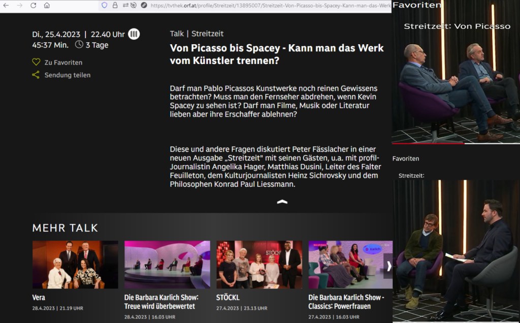 Darf man Pablo Picassos Kunstwerke noch reinen Gewissens betrachten? Muss man den Fernseher abdrehen, wenn Kevin Spacey zu sehen ist? Darf man Filme, Musik oder Literatur lieben aber ihre Erschaffer ablehnen? Diese und andere Fragen diskutiert Peter Fässlacher in einer neuen Ausgabe „Streitzeit“ mit seinen Gästen, u.a. mit profil-Journalistin Angelika Hager, Matthias Dusini, Leiter des Falter Feuilleton, dem Kulturjournalisten Heinz Sichrovsky und dem Philosophen Konrad Paul Liessmann.