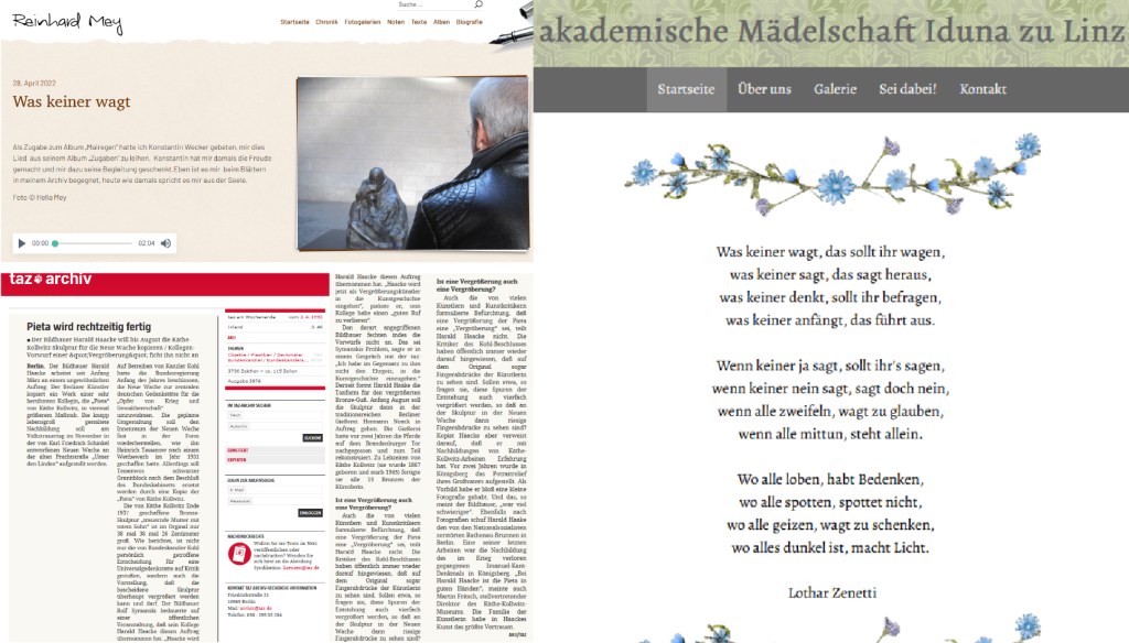 Reinhard Mey, der ebenfalls „Was keiner wagt“ singt, ihm freundlich von Konstantin Wecker überlassen, besuchte offensichtlich einmal einen Platz in Berlin mit einer Statue von Käthe Kollwitz: „Mutter mit totem Sohn“, genauer, mit einer von Harald Haake im Auftrag des damaligen Bundeskanzlers Helmut Kohl aufgeblasenen Kopie …