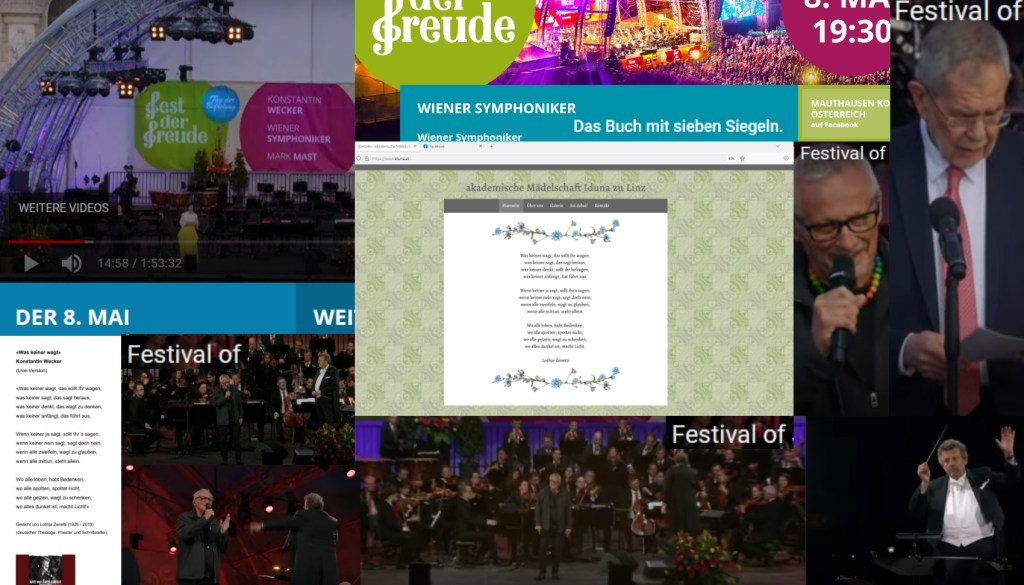Vielleicht hat die „akademische Mädelschaft zu Linz bereits beim „Mauthausen Komitee Österreich, die das „Fest der Freude“ auf dem Heldenplatz veranstaltet, sich schon erkundigt, ob sie das Video auf ihre Website stellen darf, also den Ausschnitt: Konstantin Wecker gibt gemeinsam mit dem Orchester „Wiener Symphoniker“ ihr, auch ihr Gedicht „Was keiner wagt“ …