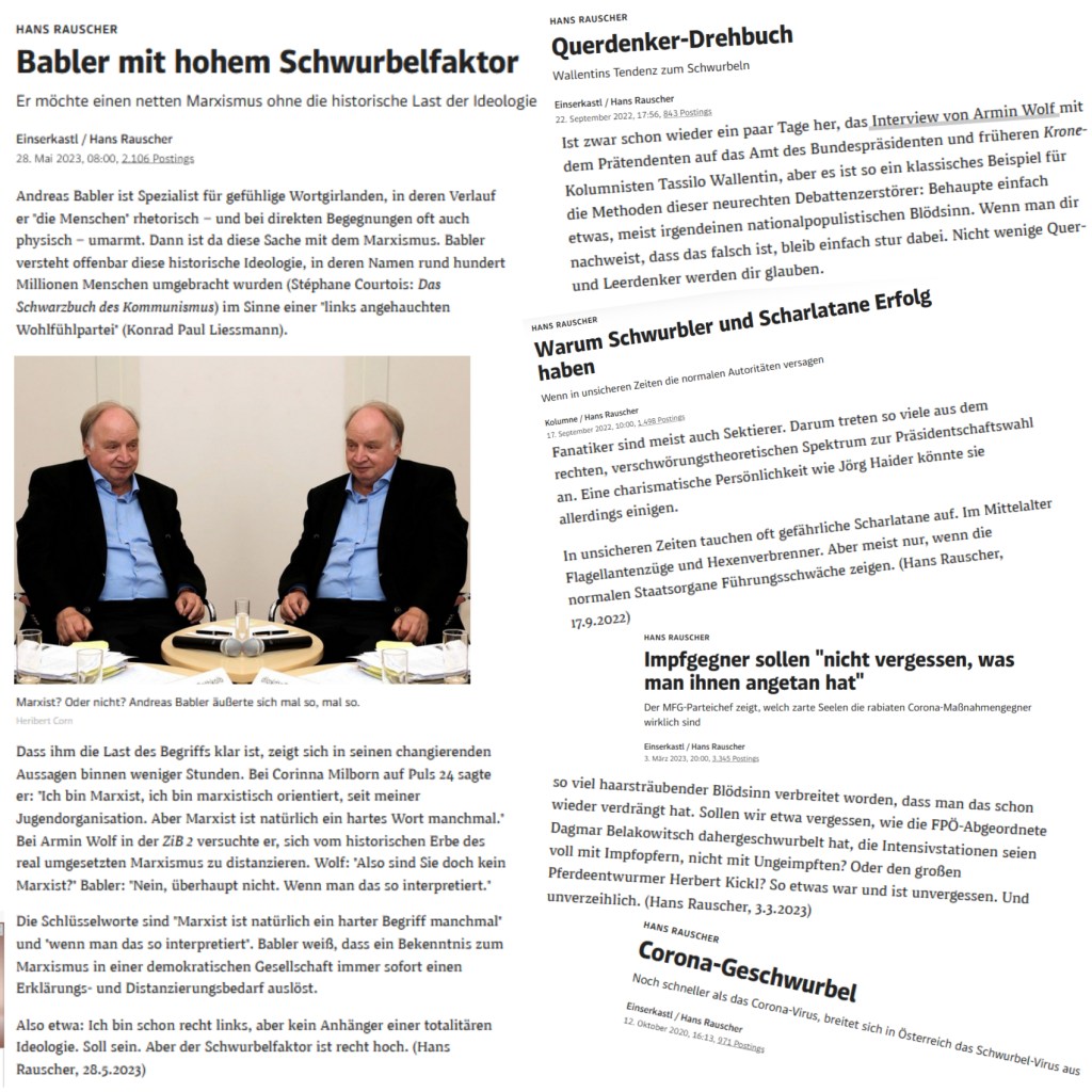 Denn sein für Andreas Babler unterstellter „hoher Schwurbelfaktor“ in seinem „…kastl“ vom 28. Mai 2023 widerspricht gänzlich seinen bereits davor aufgestellten Definitionen von „Geschwurbel“, die er, Rauscher, in sein Geschreibe goß, etwa am 3. März 2023, am 17. September 2022, am 12. Oktober 2020, am 22. September 2022 …