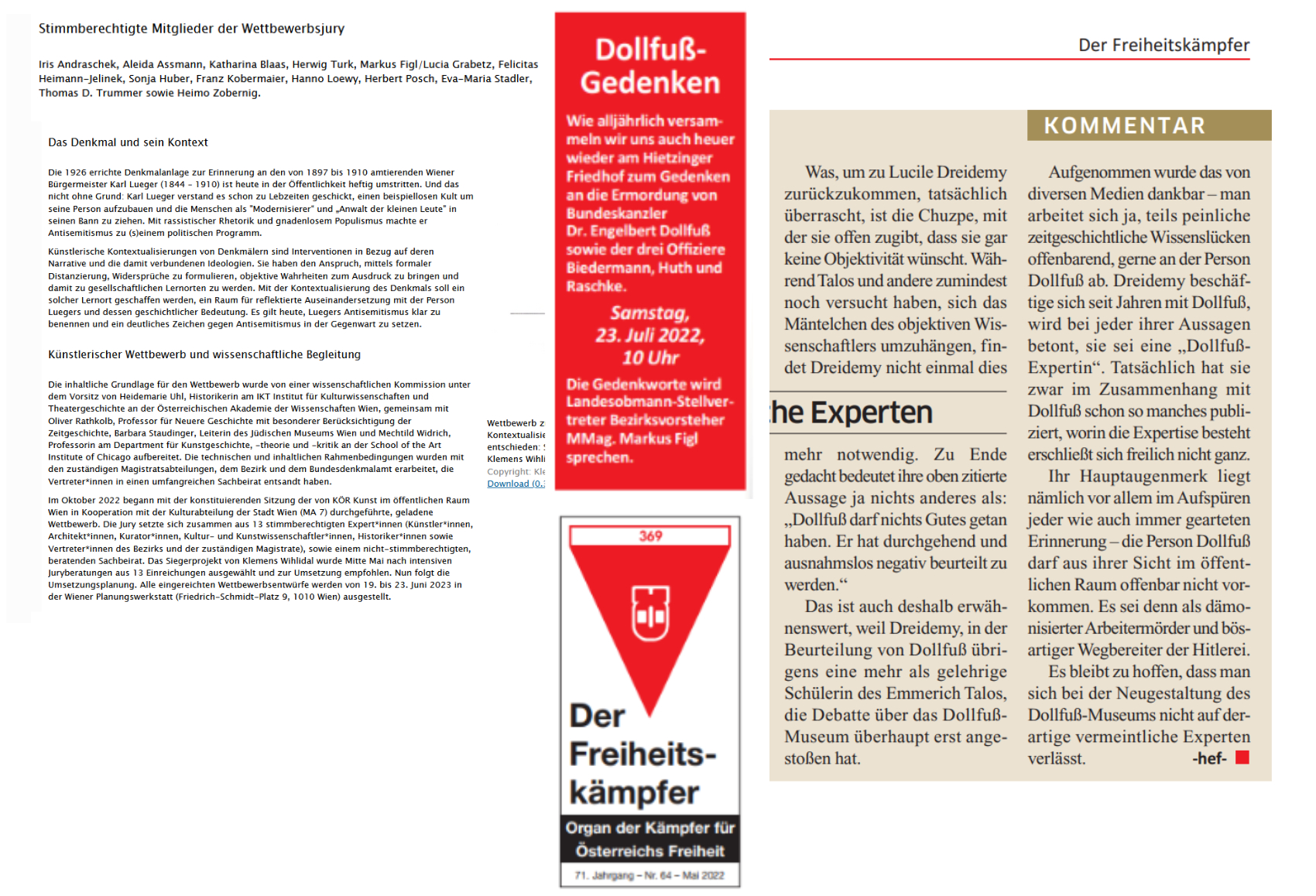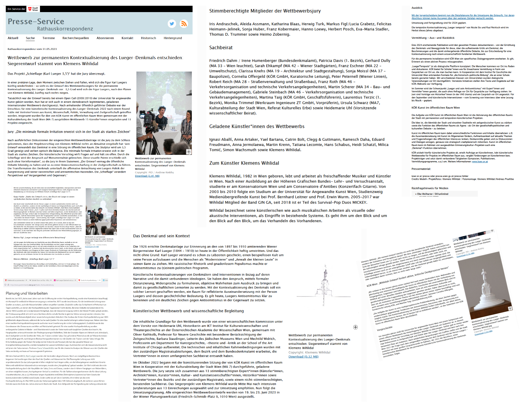 Wettbewerb zur permanenten Kontextualisierung des Lueger-Denkmals entschieden: Siegerentwurf stammt von Klemens Wihlidal – Das Projekt „Schieflage (Karl Lueger 3,5°)“ hat die Jury überzeugt. Rathauskorrespondenz vom 31. Mai 2023, Presse-Service der Stadt Wien