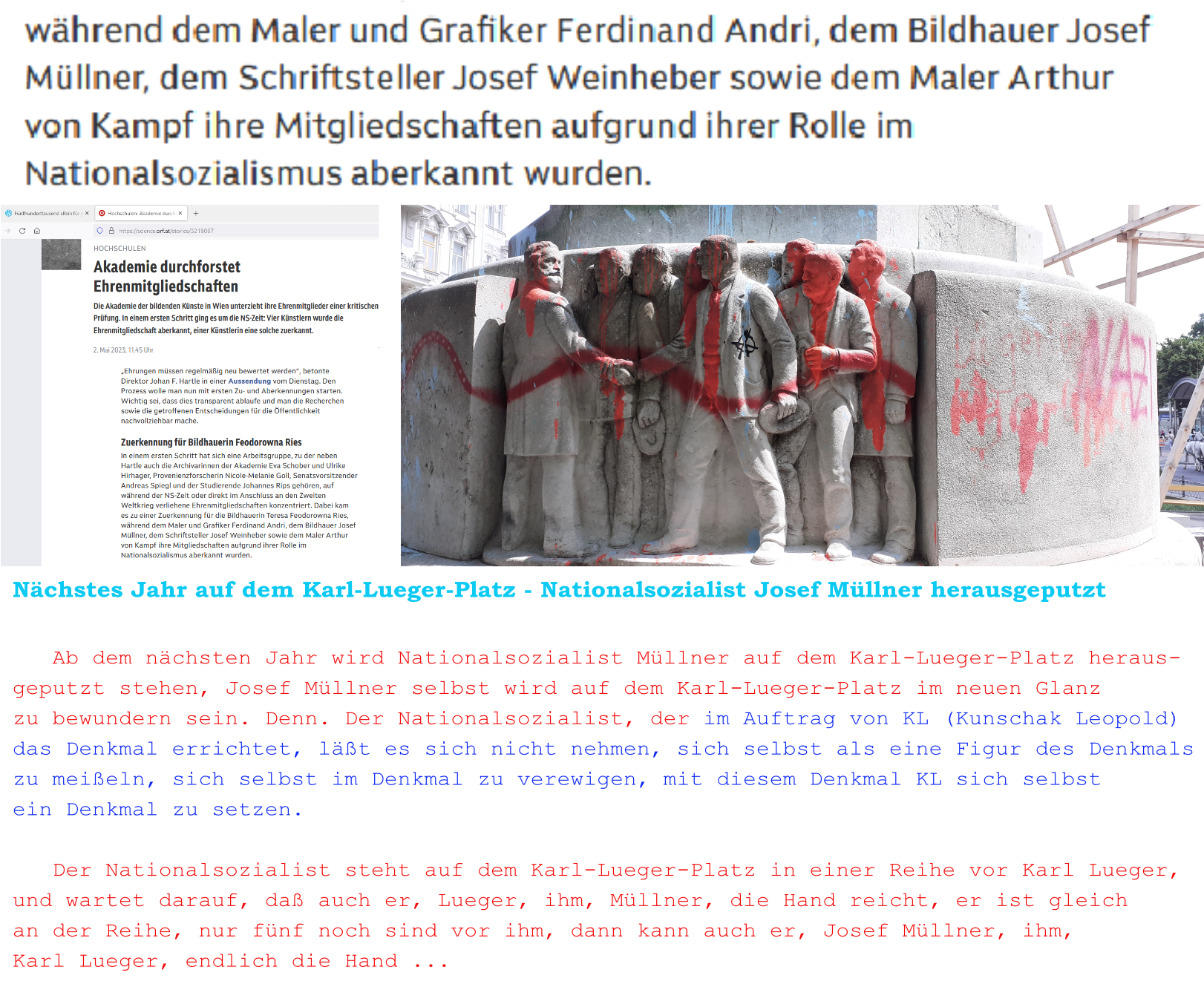 Während die Akademie der bildenden Künste, wie im Mai 2023 bekanntgegeben, Nationalsozialist Josef Müllner die Ehrenmitgliedschaft aberkennt, wird im Mai 2023 beschlossen, sein Denkmal KL auf dem Karl-Lueger-Platz zu säubern, zu putzen, zu reinigen …