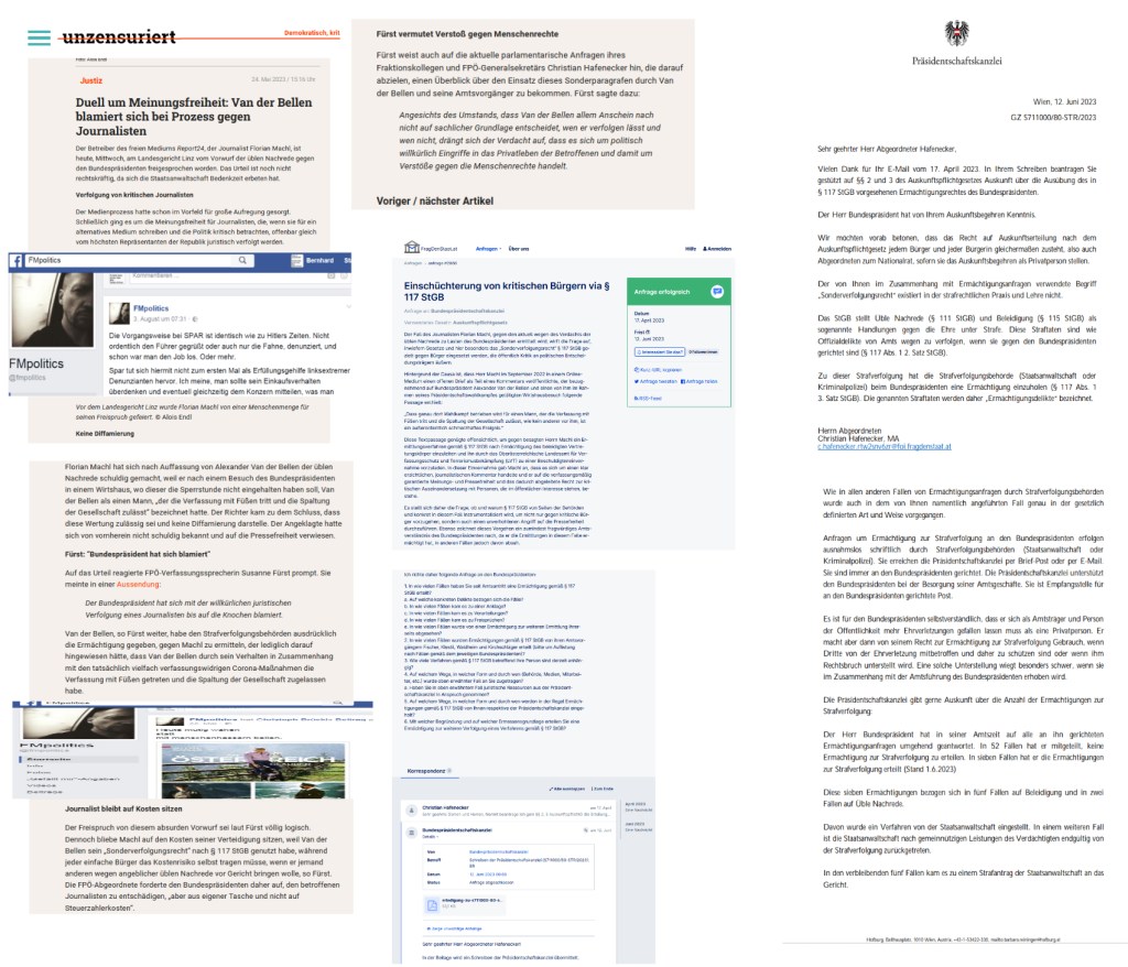 wie der Generalsekretär dieser Gesinnung, der sich sogar mit einem Antrag auf Auskunftspflicht für Florian Machl stark macht, auf den die Präsidentschaftskanzlei am 12. Juni 2023 antwortete, nicht ohne darauf hinzuweisen, daß das von dem Gesinnungsgeneralsekretär genannte „Sonderverfolgungsrecht“ gar nicht gibt; es könnte von einer „Blamage“ des Parlamentariers gesprochen werden, nicht zu wissen, welche Rechte es in Österreich gibt und welche nicht, so wie die Parlamentarierin in ihrer Aussendung davon spricht, der Bundespräsident habe sich „bis auf die Knochen blamiert“ … Der Gesinnungsgeneralsekretär hat sich nicht blamiert, er weiß schon, welche Gesetze es gibt und welche nicht, ebenso weiß er, daß gesinnungsgemäß schon recht gewußt und sofort recht gedeutet wird, was gemeint ist, wenn er von „Sonderverfolgungsrecht“ schreibt … nicht nur Florian Machl wird ihn auf Anhieb verstanden haben —