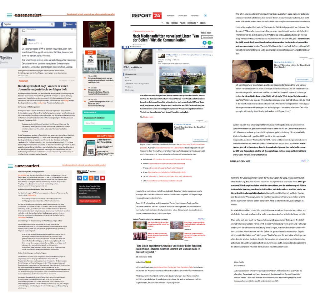 Es will gar nicht auf das eingegangen werden, was Florian Machl am 18. September 2022 geschrieben hat, zu vernachlässigbar ist dies, zu übergehbar ist dies, was für Alexander Van der Bellen offensichtlich nicht vernachlässigbar, übergehbar war, und was nun das Gericht als vernachlässigbar, übergehbar feststellte, wenn auch noch nicht rechtskräftig, vor allem vor dem Hintergrund, was Florian Machl sonst schon von sich gegeben hat, auch gegen den derzeitigen Bundespräsidenten, als dieser noch ein Kandidat war, werden von Florian Hain, wie sich Florian Machl auch nennt und vielleicht nicht mehr nennt, die Vorgangsweise von einem Lebensmittelkonzern als „identisch zu Hitlers Zeiten“ hingestellt …