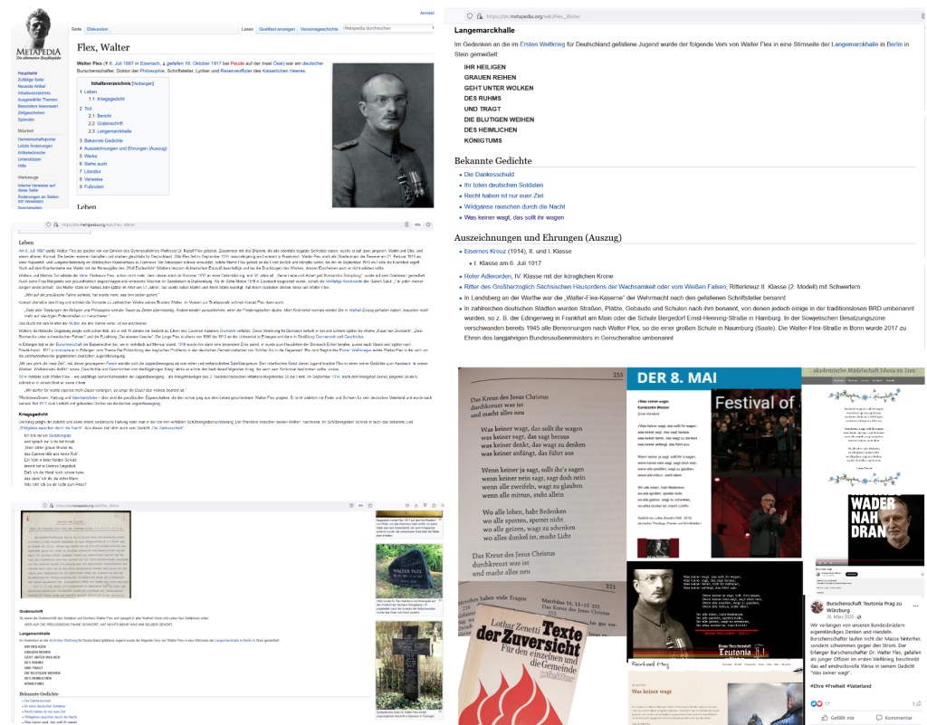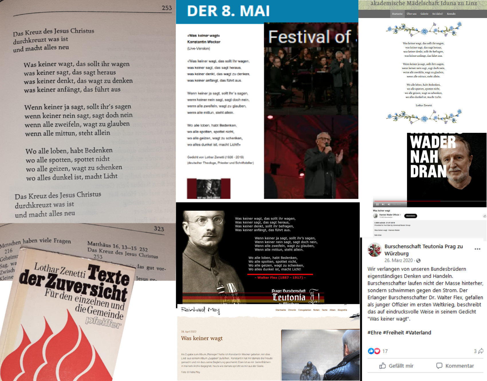 Und auch für „Die „alternative Enzyklopädie“ ist Walter Flex der Gedichtheld von „Was keiner wagt, das sollt ihr wagen“, gesinnungsgemäß ohne Spekulation, daß es auch ein Gedicht von Zenetti sein könnte, nein, ihr es nur von Walter Flex sein kann, diesem 1917 schließlich selbst Ermordeten im Krieg von 1914 bis 1918 …