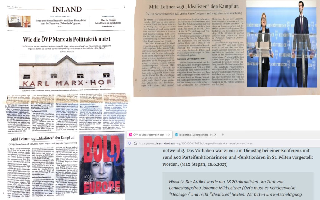Freilich, Johanna Mikl-Leitner hat nicht von „Idealisten“ gesprochen, es war ein Irrtum der Tageszeitung, den sie auf ihrer Website einbekannte, und wahrscheinlich wird in einer der nächsten Ausgaben dieser Tageszeitung das auch bekanntgegeben werden, daß es ihr Irrtum war. Johanna Mikl-Leiter und mit ihr ihre Partei reden von „Ideologen“ und nicht von „Idealisten“, aber deren Idealismus ist ihre Ideologie, die bei dieser Gesinnungsgemeinschaft mit Weltanschauung recht genauer benannt ist …