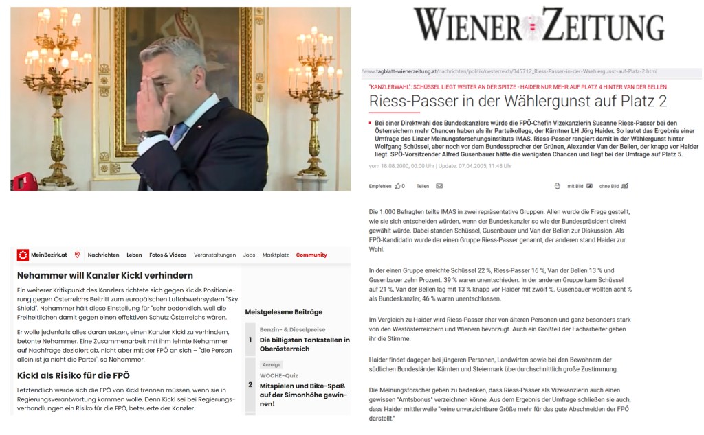 War je ein Obmann, eine Obfrau dieser Partei in der sogenannten Kanzlerumfrage an erster Stelle, noch dazu schon über eine so lange Zeit? Nicht mal jener Anführer, der vor dreiundzwanzig Jahren nicht in die Regierung durfte, als mit Trickserei eine volksparteilich blaue Regierung installiert wurde, soweit erinnerlich, hat dies geschafft.