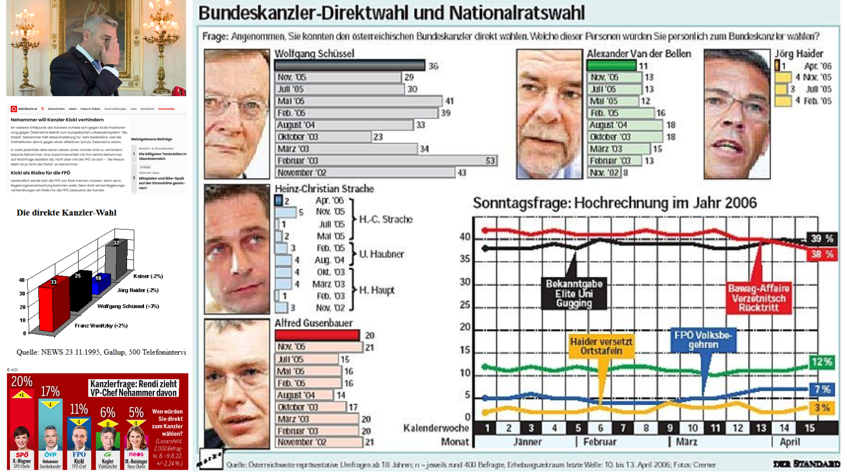 War je ein Obmann, eine Obfrau dieser Partei in der sogenannten Kanzlerumfrage an erster Stelle, noch dazu schon über eine so lange Zeit? Nicht mal jener Anführer, der vor dreiundzwanzig Jahren nicht in die Regierung durfte, als mit Trickserei eine volksparteilich blaue Regierung installiert wurde, soweit erinnerlich, hat dies geschafft.