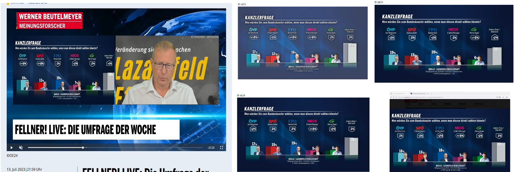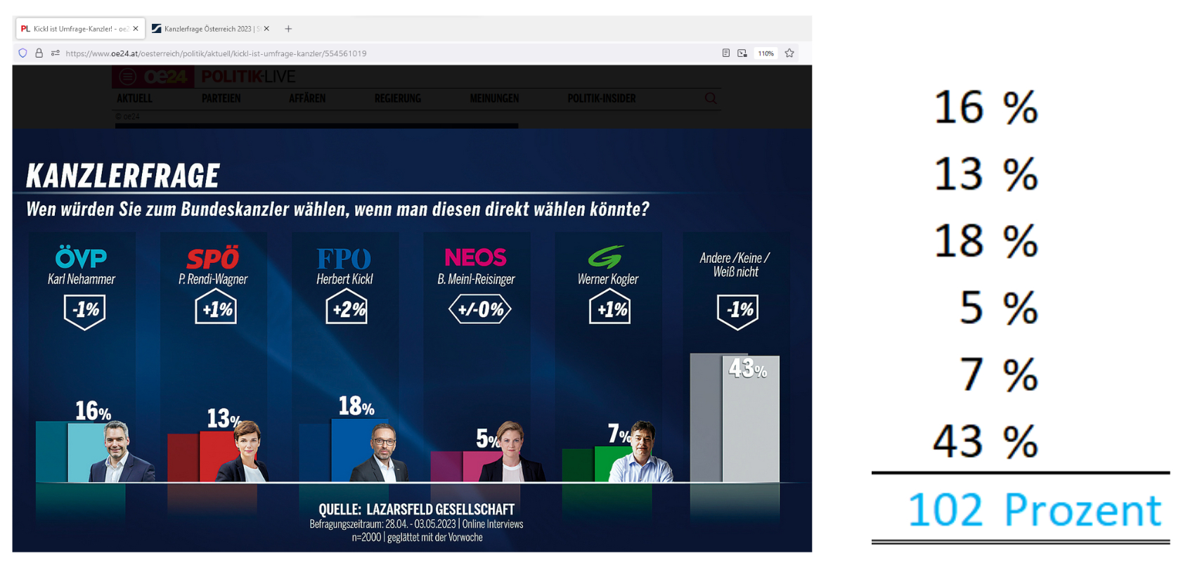 Darüber hinaus wird es, um fellnerisch zu sprechen, zu einem „Duell“ zwischen zwei Männern stilisiert, zwischen Karl Nehammer und Herbert Kickl … Ob nun die Kopfrechensumme von sechs Prozentzahlen 101 Prozent oder 102 Prozent oder … eine Konstante gibt es, weder Herbert Kickl noch Karl Nehammer bekommen je eine derart hohe prozentuale Zustimmung wie Ihre Favoritin.