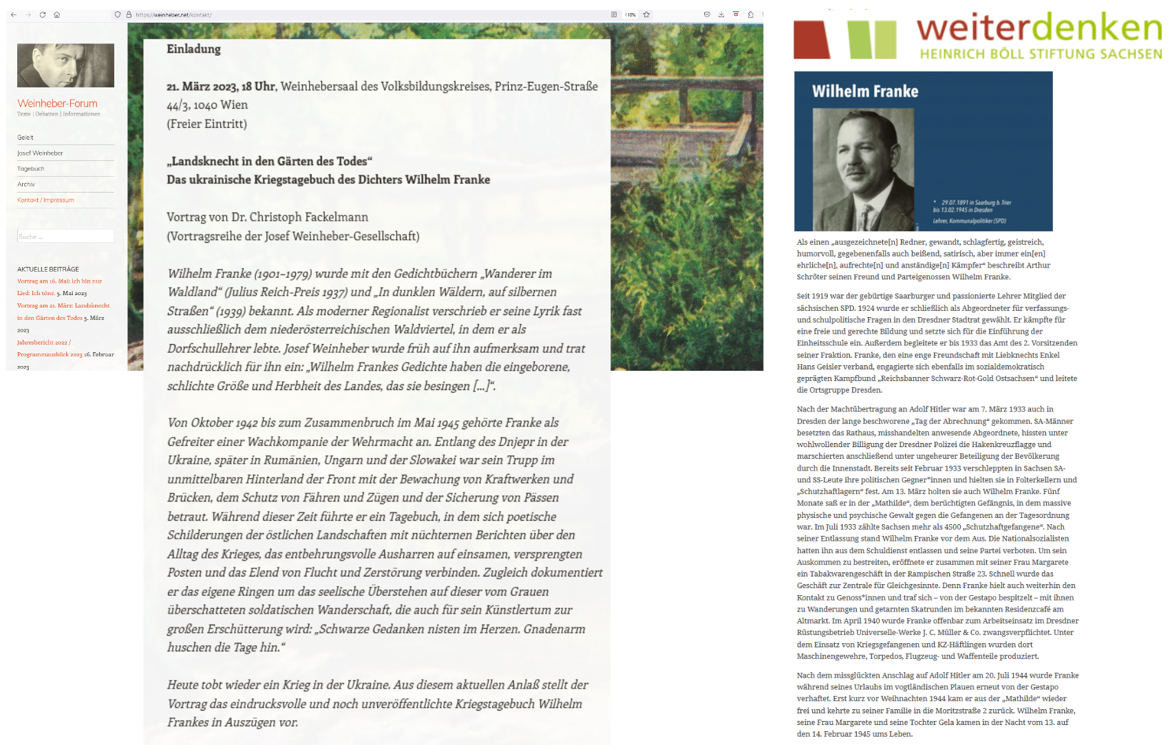 Der Gesellschaft des Josef Weinheber ist ein Krieg Anlaß, im März 2023 an Wilhelm Franke zu erinnern: „Heute tobt wieder ein Krieg in der Ukraine. Aus diesem aktuellen Anlaß stellt der Vortrag das eindrucksvolle“ — Nein, sie erinnert nicht an den Lehrer Wilhelm Franke, sondern an den dichtenden „Dorfschullehrer“