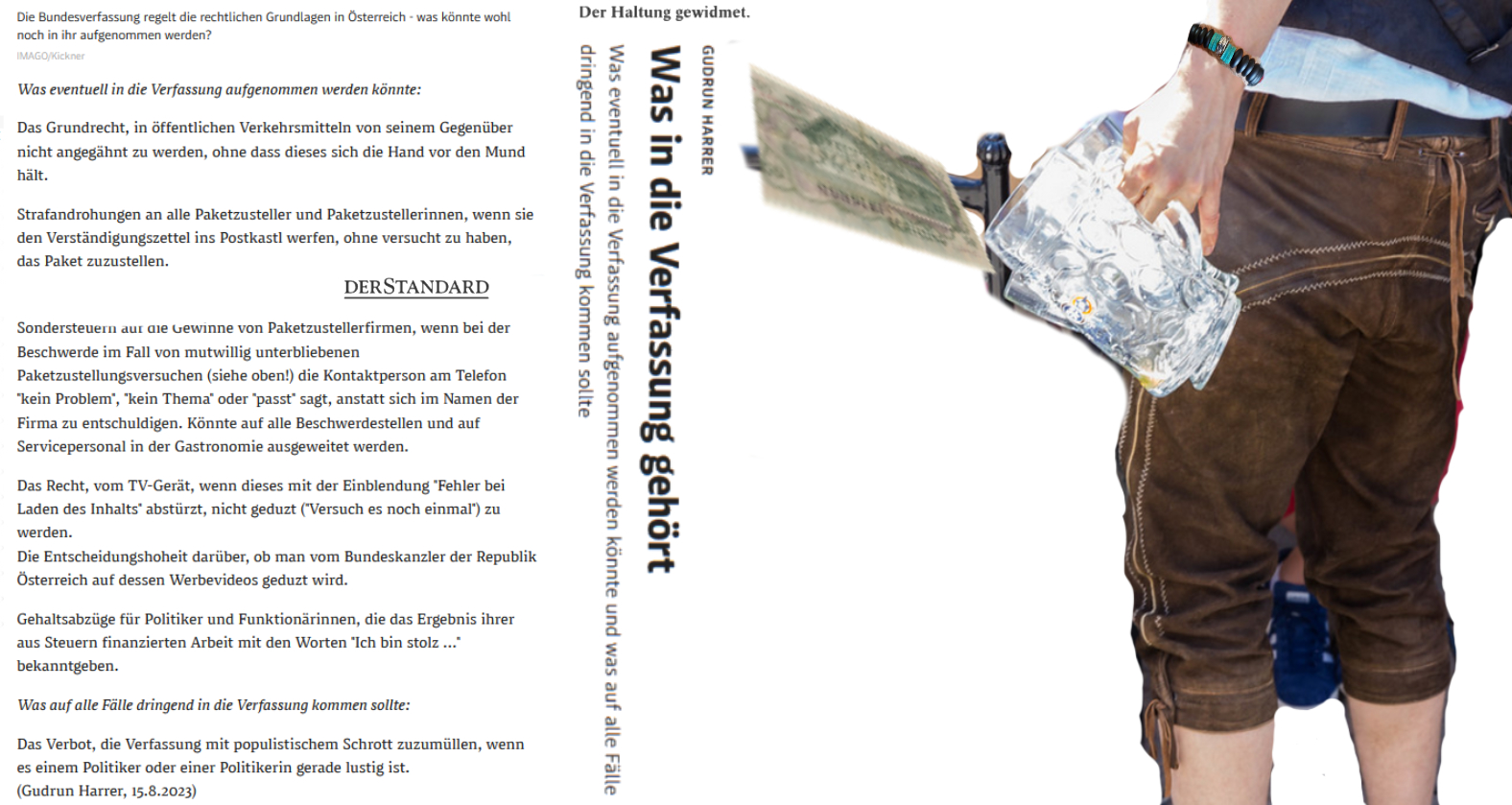 Gudrun Harrer schreibt am 15. August 2023 in der Tageszeitung des österreichischen medialen Standards allerlei Lustigkeiten, „was eventuell in die Verfassung aufgenommen werden könnte“. Sie kann Albernheiten schreiben, „was in die Verfassung gehört“, sie, Gudrun Harrer, ist nicht die Bundeskanzlerin.