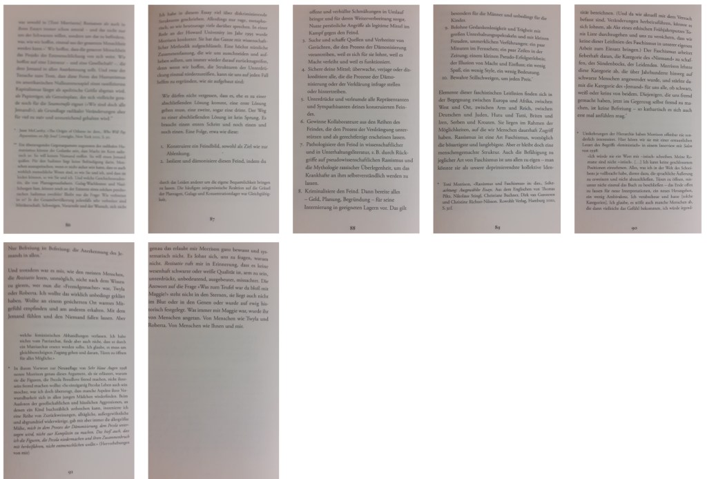 Ich habe in diesem Essay viel über diskriminierende Strukturen geschrieben. Allerdings nur vage, metaphorisch, so wie heutzutage viele darüber sprechen. In einer Rede an der Howard University im Jahr 1995 wurde Morrison konkreter. Sie hat das Ganze mit wissenschaftlicher Methodik aufgeschlüsselt. Eine höchst nützliche Zusammenfassung, die wir uns ausschneiden und aufheben sollten, um immer wieder darauf zurückzugreifen, denn wenn wir hoffen, die Strukturen der Unterdrückung einmal niederzureißen, kann sie uns auf jeden Fall helfen zu ergründen, wie sie aufgebaut sind: