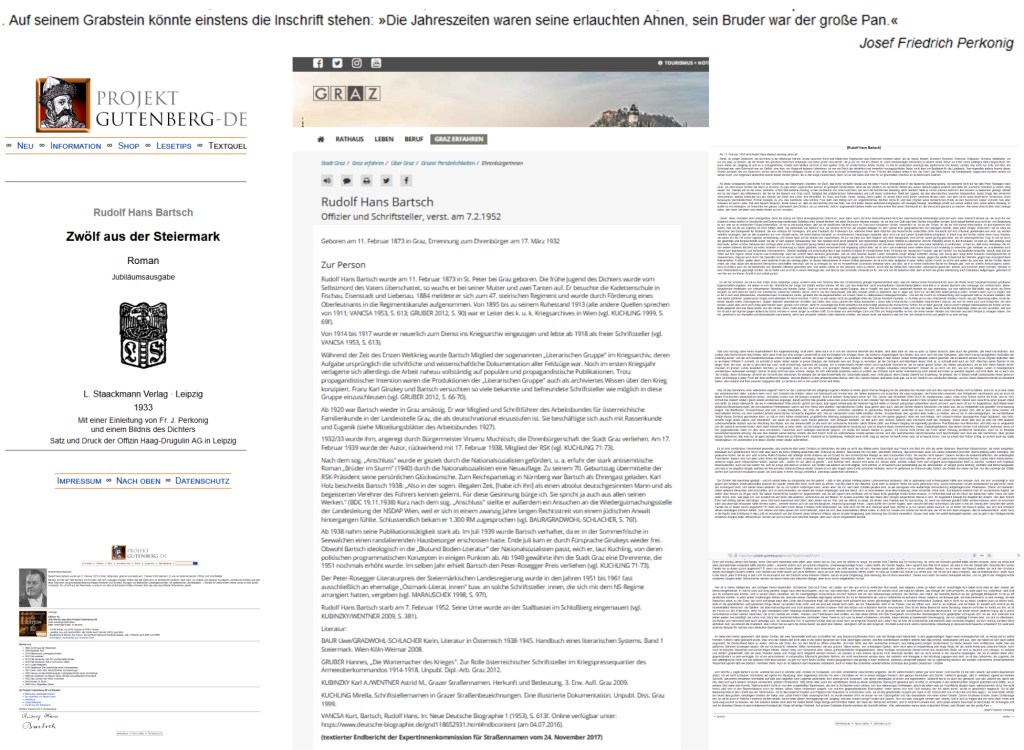 Josef Friedrich Perkonig hatte dann doch noch neunzehn Jahre Zeit, an seiner Grabinschrift zu feilen, bis Rudolf Hans Bartsch, sein Hochgelobter, endlich unter der Erde, genauer, endlich Asche in einer Urne … und so wurde seine Inschrift etwas länger, noch dichterischer, wie diese am Ehrengrab von Rudolf Hans Bartsch