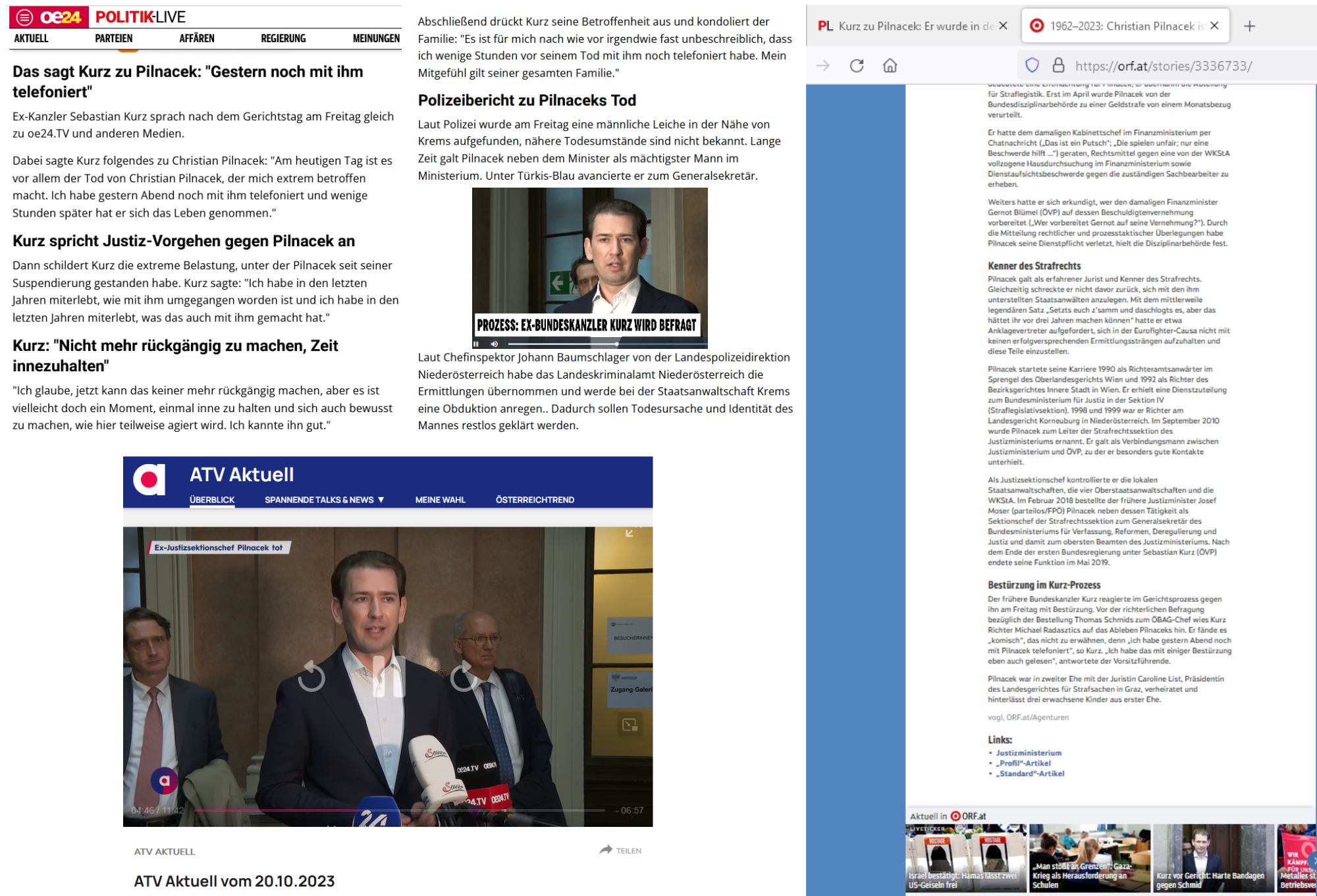 Kein Bericht aber von der Aussage des Sebastian Kurz, er, Christian Pilnacek, habe sich das Leben genommen. Auf der Website des rechtlich-öffentlichen Rundfunks Österreichs wird zwar, wie jetzt um 20.30 Uhr zu lesen ist, Sebastian Kurz erwähnt:
