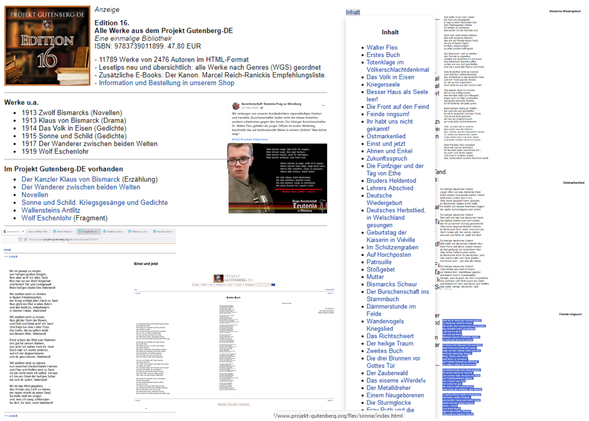 Die Gunst seiner Verbreitung hat Walter Flex nie verlassen, bis zum Heute herauf, wurde ihm nie entzogen, auch mit dem „Projekt Gutenberg-DE“, einem Projekt, das nicht der sogenannten Parallelgesellschaft zugeschlagen werden kann, wird ihm, Walter Flex, die Gunst erwiesen, ihn vor dem Vergessen zu bewahren,