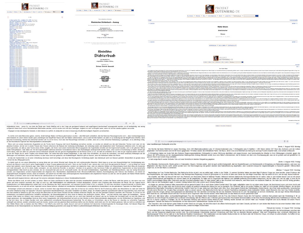 Freilich, dafür muß auf „Projekt Gutenberg-DE“ tief gegraben werden, und das erstaunt nicht, über Jahrzehnte war es opportun, alles, was von einer Person nicht öffentlich gemacht werden sollte, gemeint wurde, es öffentlich nicht zu sagen,, so tief zu vergraben, daß es, so die sonderliche Hoffnung in einer seltsamen Diensteifrigkeit für derartige Personen, auf ewig unauffindbar bleibe, und es ist bis heute herauf so geblieben, bis heute herauf wird das, was von einer Person öffentlich verschwiegen bleiben soll, auch, damit es unterirdisch weiter wirke, tief vergraben, eine leichte Zugänglichkeit verwehrt.