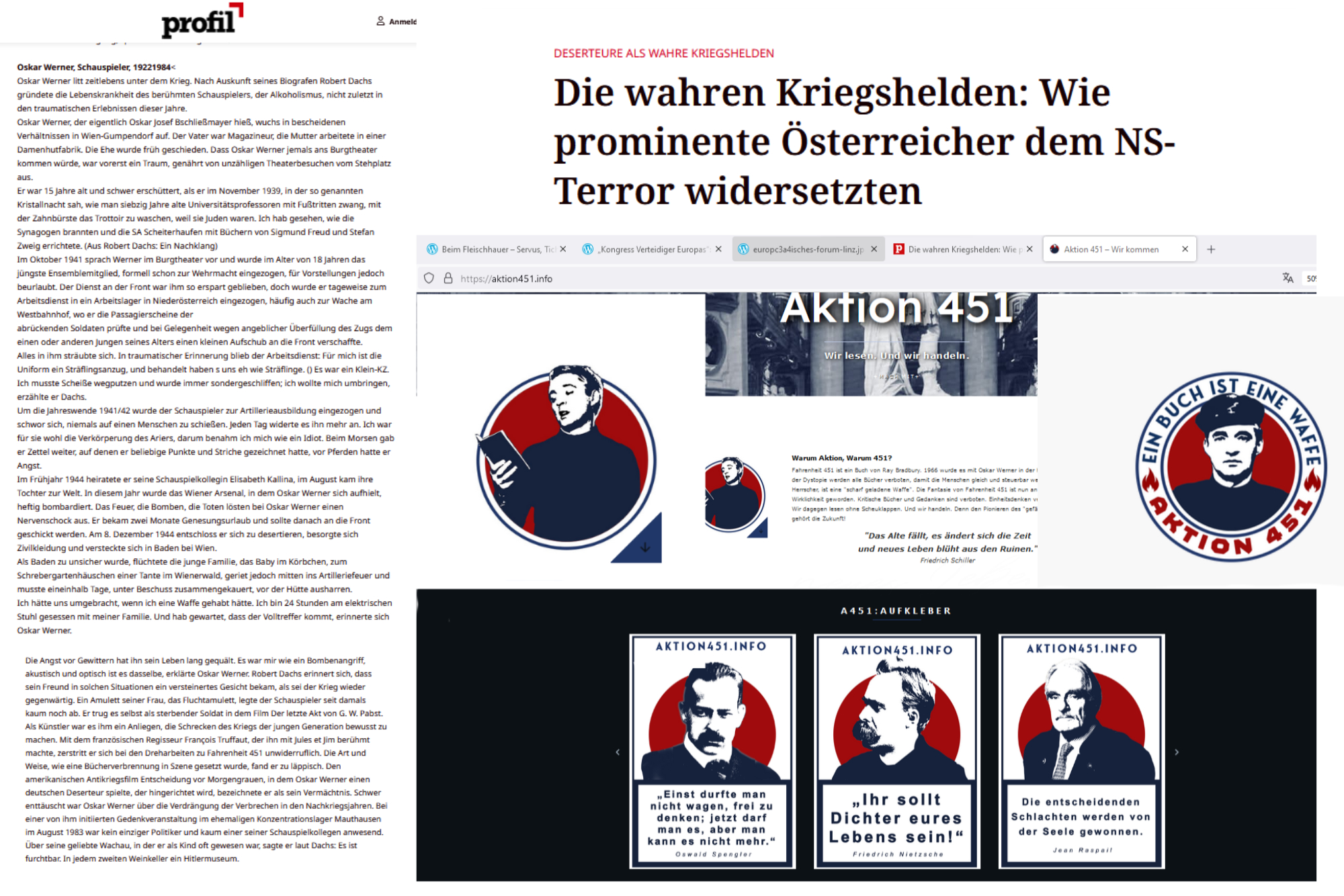 Und das kommt bereits in einem Artikel aus dem „Profil“ vom 29. August 2009 zum Ausdruck: „Die wahren Kriegshelden: Wie prominente Österreicher dem NS-Terror widersetzten“, den zu ziterieren vollkommen ausreicht, um die lächerliche Verwechslung von Phantasie und Wirklichkeit dieser Gesinnungsschaft, um die lächerliche Verkehrung von Wirklichkeit und Einbildung — Sogar zu der Verfilmung des Buches, auf das sich „Aktion 451“ dieser Gesinnungsschaft meint beziehen zu müssen, hat Oskar Werner etwas zu sagen, er rückt Film und Wirklichkeit zurecht.