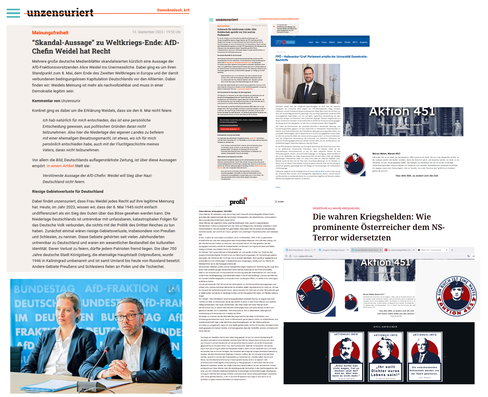 „Aktion 451“, eine Website ohne Impressum, aber es muß auch nicht gewußt werden, wer die Treiber dieser Website sind, die Treiberinnnen dieser Website sind welche aus dieser Gesinnungsschaft, zu der gehören die oben erwähnte Partei und zu der die oben erwähnte gesinnungsgemäß zensurierte Website und so weiter und so fort. „Aktion 451“ trat, so die gesinnungsgemäß zensurierte Website, trat als Organisatorin auf, angemeldet wurde die Kundgebung, ist in Medienberichten zu lesen, vom „RFS“, von dem „Ring freiheitlicher Studenten“,