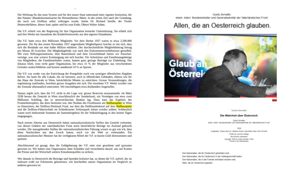 Das obige Zitat von Guido Zernatto aus seiner „Die Wahrheit über Österreich“, daß dem Staat Österreich von 1934 bis 1938 eine Verfasssung zugrundegelegt war, die „war ein Mittelding zwischen parlamentarischer Demokratie und Fascismus“, läßt dazu neigen, diese Zeit in Österreich als die Zeit des „Austrofaschismus“ zu bezeichnen, in dieser Uneindeutigkeit, in dieser Schlampigkeit, in diesem Grauen davor, eindeutig und unmißverständlich Stellung zu beziehen. Ein Staatssekretär, ein Minister, ein Generalsekretär der „Vaterländischen Front“, ein Präsident des „Katholischen Schriftstellerverbandes“, ein Bundeskulturrat, also Guido Zernatto, hat 1938 in seiner „Wahrheit“ vom „Faschismus“ seines Regimes geschrieben, als „Mittelding“ …