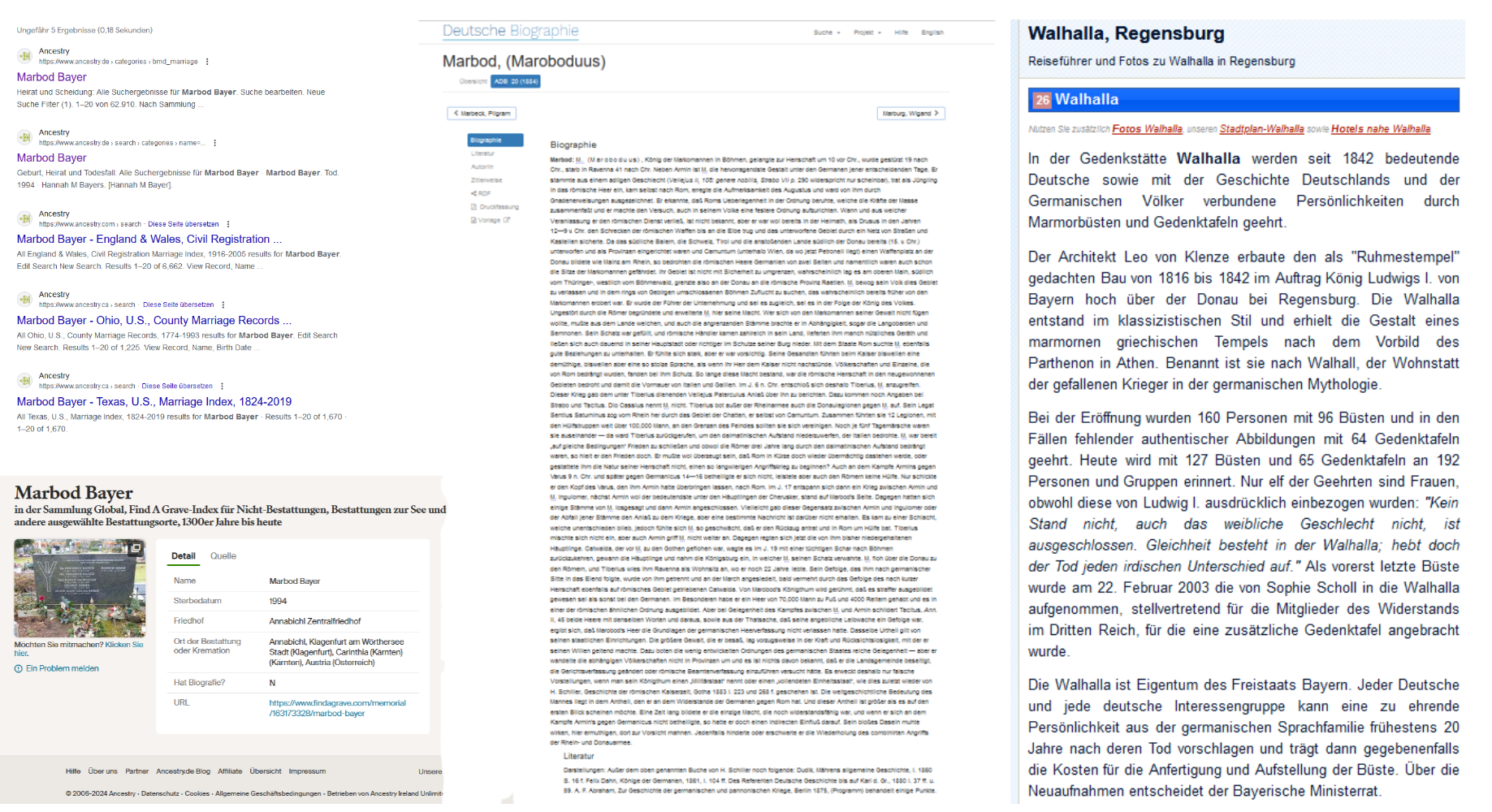 „Hat Biografie? N“ … Das „N“ für „No“, für „Nein“? Was muß das für ein Leben gewesen sein, so ganz ohne Biographie? Ein Wünschenswertes, gestorben zu sein, ohne geboren worden zu sein; jedenfalls hat das Internet über dieses Leben nichts zu berichten, außer Sterbedatum und Bestattungsort … Und wer nur nach dem Namen „Marbod“ allein sucht, landet beim „König der Markomannen in Böhmen, gelangte zur Herrschaft um 10 vor Chr., wurde gestürzt 19 nach Chr., starb in Ravenna 41 nach Chr. Neben Armin ist M. die hervorragendste Gestalt unter den Germanen jener entscheidenden Tage“ … und landet bei der Gedenkstätte „Walhalla“ in Regensburg, in der auch Marbod mit einer Gedenktafel geehrt …