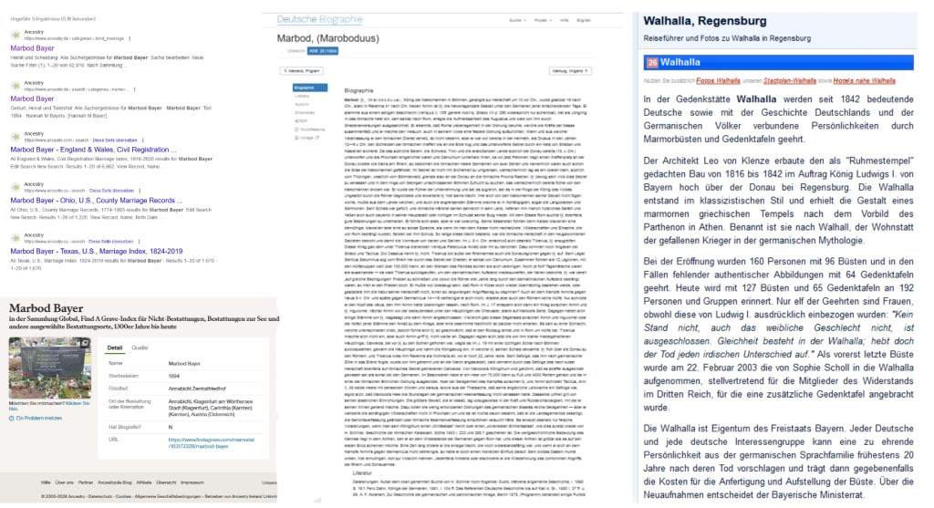 Und dann gibt es auf diesem Grabstein noch einen Namen, einen Namen von solch einer Seltenheit, Besonderheit — „Marbod“, der dazu verleitet, herausfinden zu wollen, was und wer war der Begrabene mit dem Namen „Marbod Bayer“. Kein Hinweis, und das steigert das Interesse noch, auch auf eine verwandschaftliche Zugehörigkeit zu Rainer, zu Zlupetzky … Ein Name, der die Grenzen des Internets aufzeigt. Denn. Zu diesem Namen sind nur fünf Einträge zu finden, und die verweisen alle fünf auf die Website „Ancestry“, und auf dieser ist nur zu lesen:
