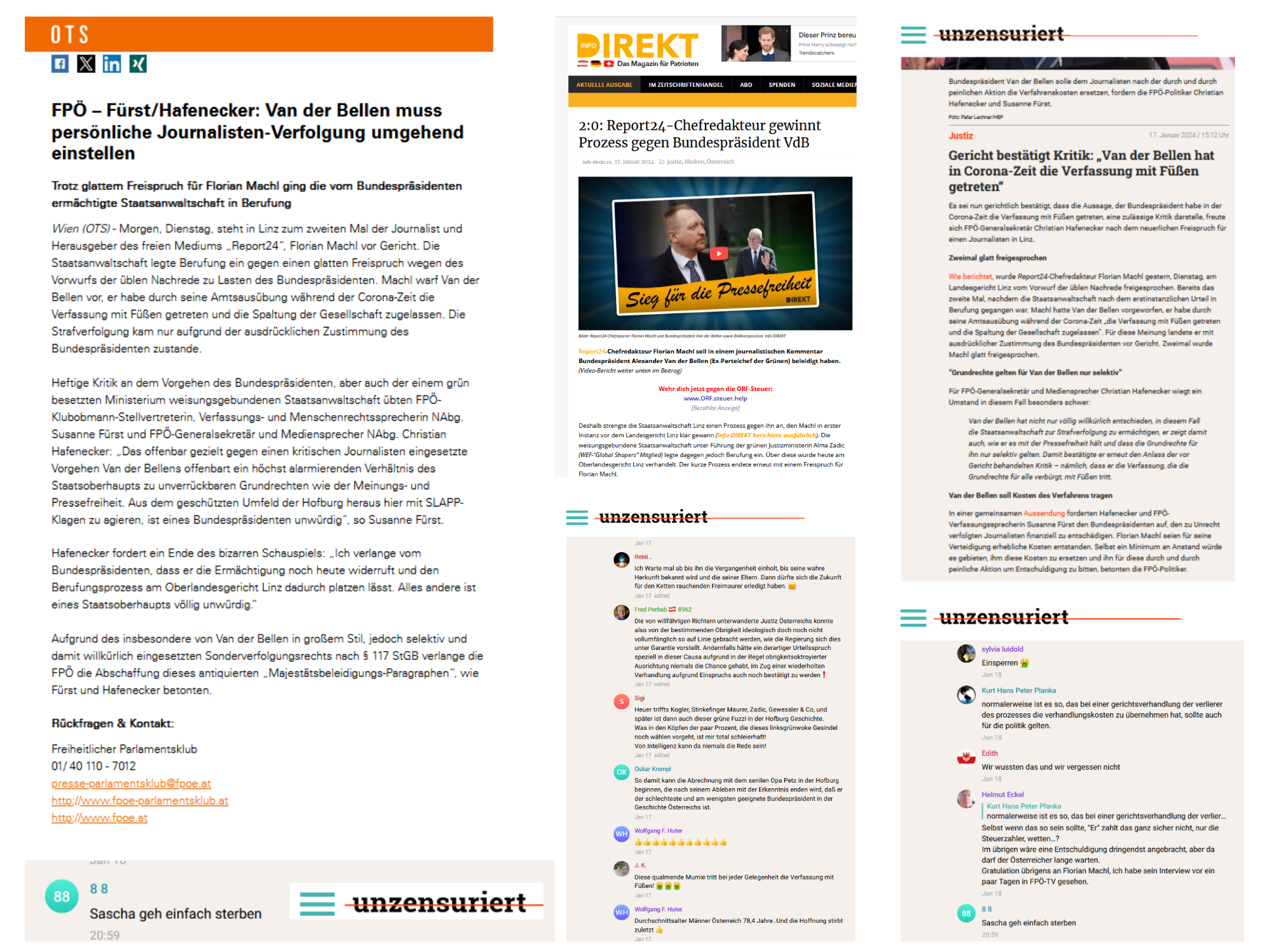 Wie läppisch das Machlische war, läßt sich auch aktuell wieder vergleichen, wenn auf der gesinnungsgemäß zensurierten Website Kommentare zu dem Freispruch vom 16. Jänner 2024 zu lesen sind, die derart abgründig sind, und dies nicht zum ersten Mal, und nicht zum ersten Mal, daß ein Zitieren sich von selbst verbietet. Etwa der Kommentar von einer Figur,
