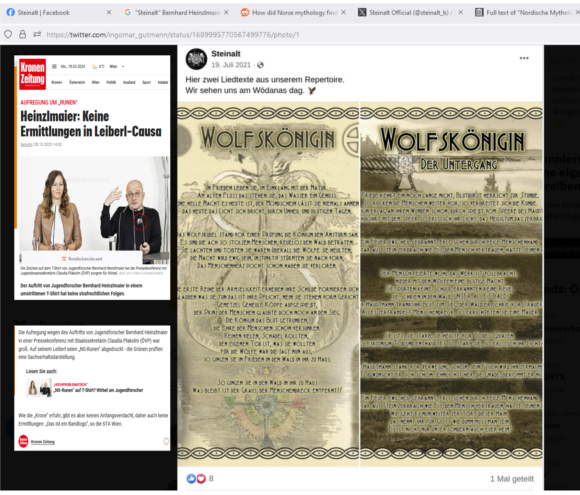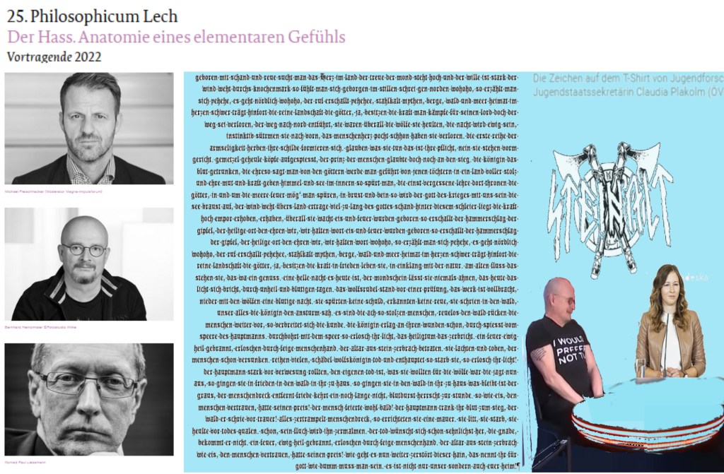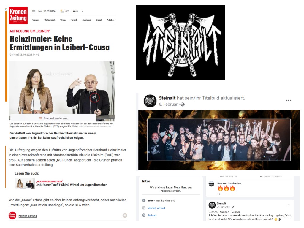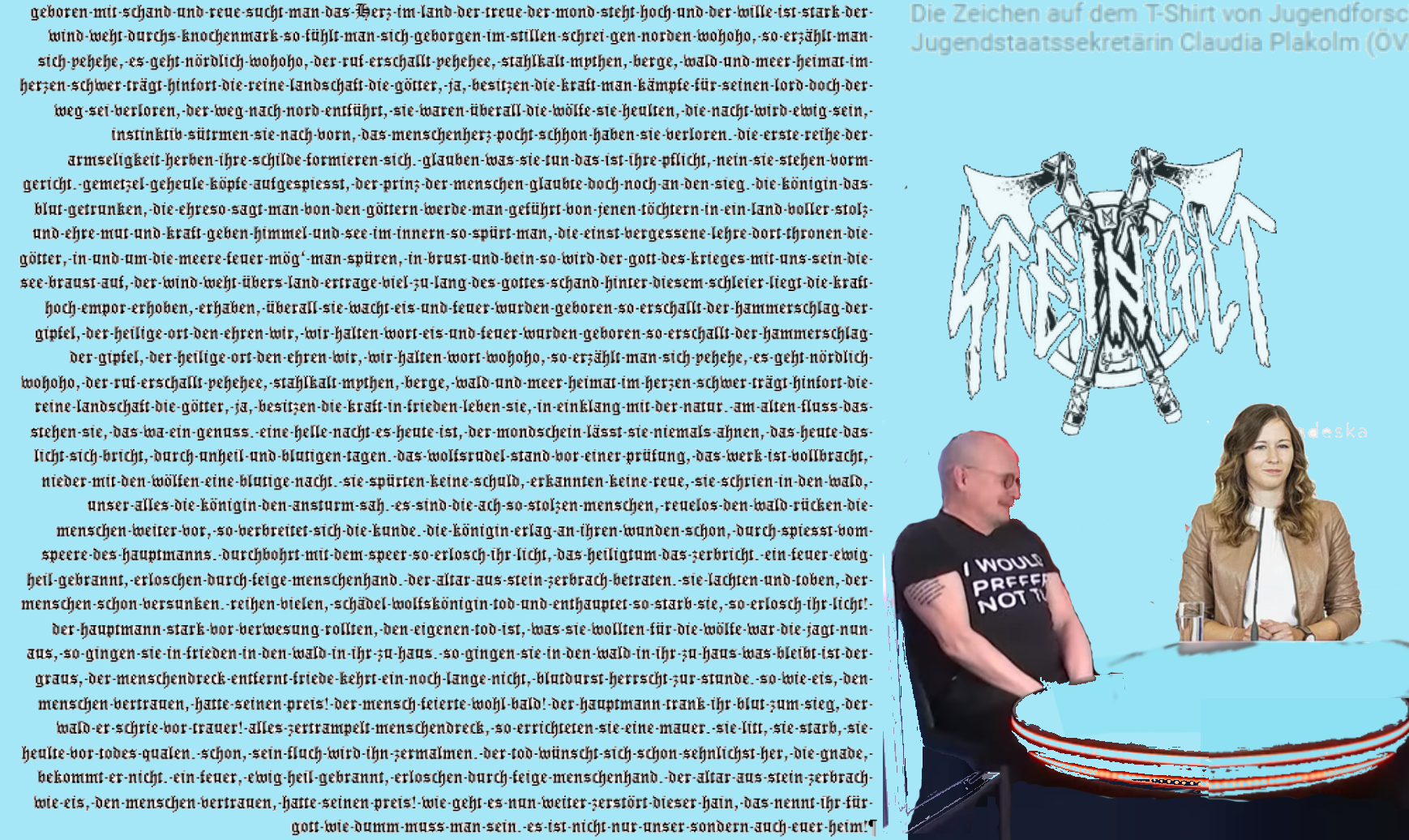 Es will erzählt werden, das versprochen wurde, dieses Kapitel hat seinen Ausgang bei Bernhard Heinzlmaier, der einem Liedgut derart ergeben ist, daß er es der ganzen Welt, also seiner Welt Österreich zeigen muß, das Liedgut der Band „Steinalt“ … Es begann mit einer Pressekonferenz, in der er nicht Lieder von „Steinalt“ zum Besten gab, sondern bloß das Logo dieser Band herzeigte, neben ihm oder er neben ihr Claudia Plakolm, Staatssekretärin für Jugendangelegenheiten, Zivildienst und seit kurzem auch für Digitalisisierung. Hätte Bernhard Heinzlmaier in dieser Pressekonferenz nicht ein T-Shirt getragen, das nur einen Teil des Logos von „Steinalt“ zeigt, also die augenblicklich zur Aufregung gewordenen Runen, sondern das gesamte Logo von „Steinalt“, also auch die Äxte, damit sofort erkennbar als Logo der Kapelle aus dem Niederösterreichischen, es wären die Runen gar nicht sehr aufgefallen …