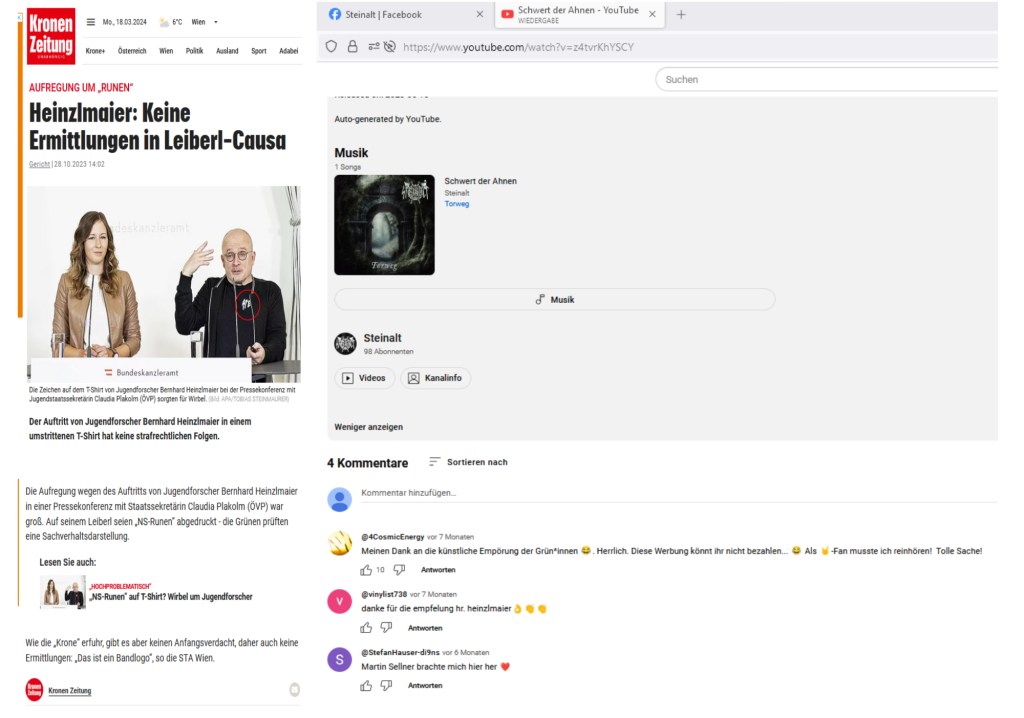 „Steinalt“ — das Liedgut, von dem nicht nur Bernhard Heinzlmaier recht angetan ist, sondern offensichtlich auch Martin Sellner, wie am 19. März 2024 auf der Konzernplattform „Youtube“ zu lesen ist, auf der mit einem Herz zum Danke einbekannt wird: „Martin Sellner brachte mich hier her“ … und „danke für die empfehlung hr. heinzlmaier“ —