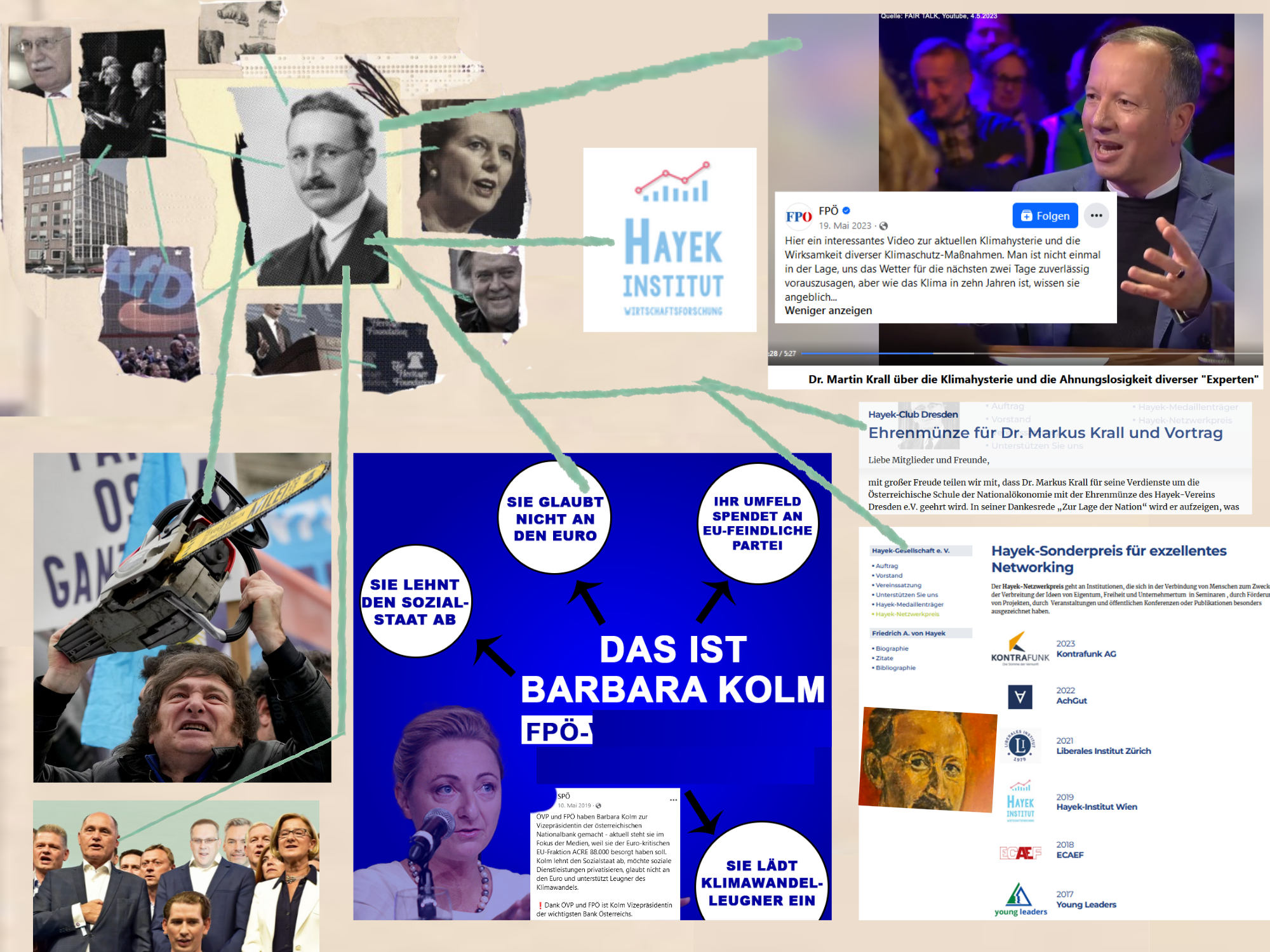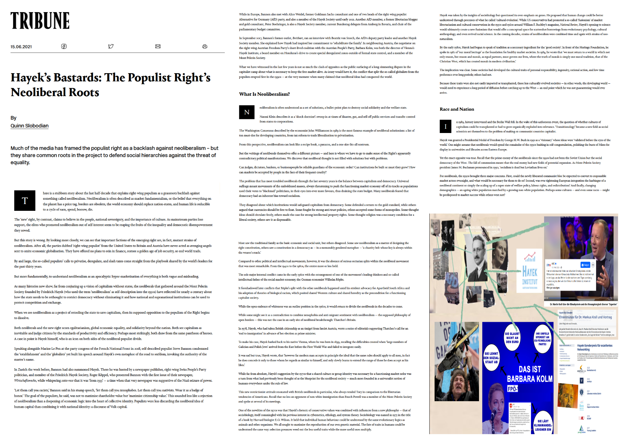 Im September 2017 veröffentlichte Bannons früheres Portal «Breitbart» ein Interview mit Beatrix von Storch, stellvertretende Vorsitzende der Bundestagsfraktion der AfD und ebenfalls Mitglied der Hayek-Gesellschaft. Sie erklärte, wie Hayek sie zu ihrem Engagement für «die Wiederherstellung der Familie» inspiriert habe. Im benachbarten Österreich war Barbara Kolm die Vermittlerin der kurzen Koalition zwischen der rechten FPÖ und der ÖVP. Sie ist sowohl Leiterin des Friedrich A. von Hayek-Instituts in Wien, beteiligt an Honduras’ Versuch, spezielle deregulierte Zonen ausserhalb der formalen staatlichen Kontrolle aufzubauen, als auch Mitglied der Mont Pèlerin Society.
