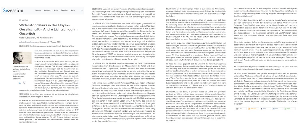 Mit einem, der von sich selbst sagt, der Hayek-Gesellschaft in Deutschland anzugehören, soll das Kapitel Hayek geschlossen werden, es ist ein Mann, von dem manches zu erzählen war, von dem nichts mehr erzählt werden will, außer, daß er beispielsweise einem Mann einmal ein Interview gab, das alles sagt,