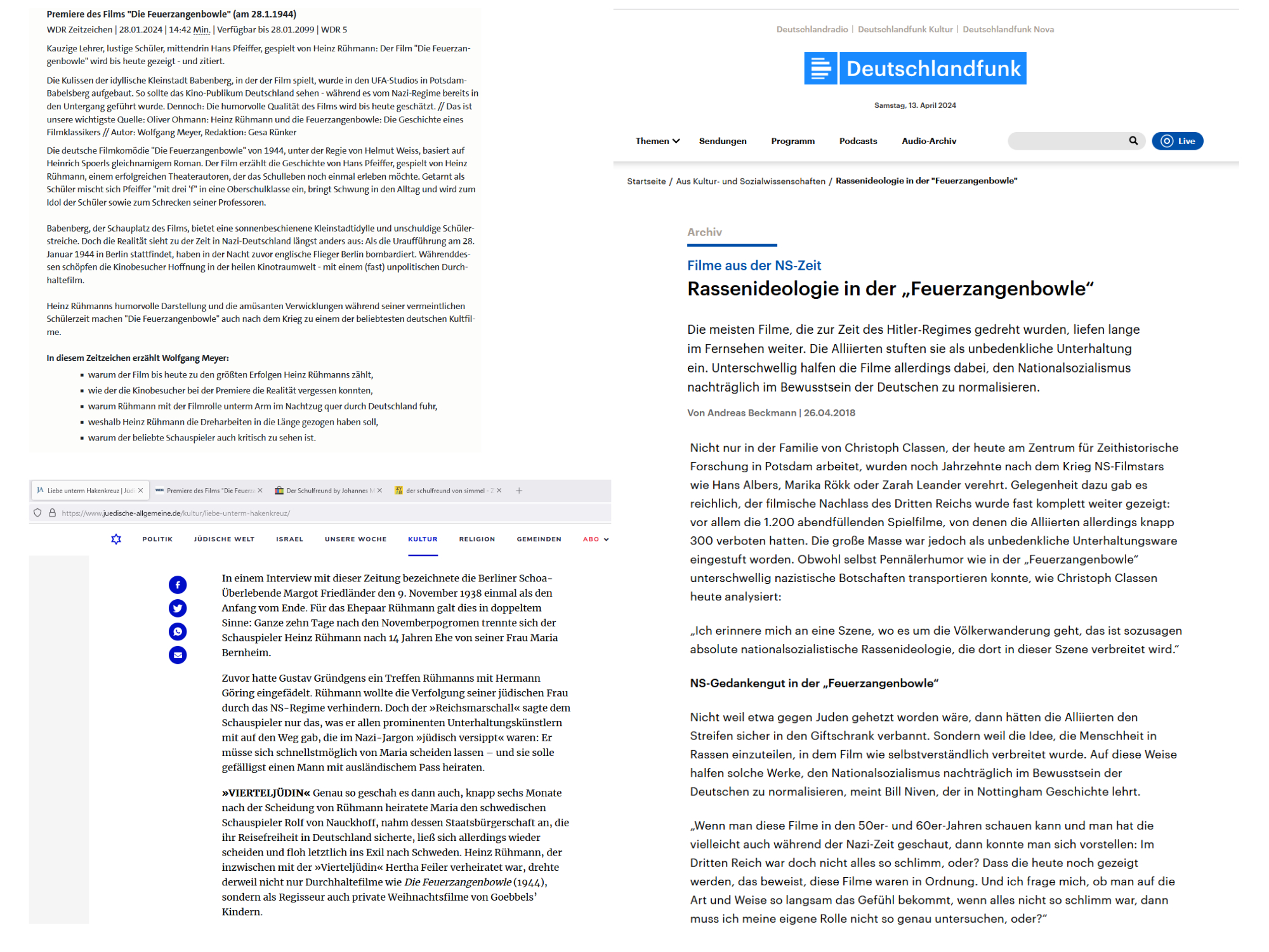 Der Spielleiter schrieb keinen Brief an Hermann Göring mit der Bitte, den Krieg zu beenden, er nahm von Hermann Göring einen Rat an, der ihn, Heinz Rühmann, persönlich nicht ins Unglück stürzte, sondern erfolgreiche Zeiten bescherte, so war es ihm etwa vergönt, „private Weihnachtsfilme“ der Kinder von Joseph Goebbels zu drehen, aber auch, um noch einen Film als Beispiel anzuführen, weil in diesem auch ein Brief eine Rolle spielt, den Komödianten mitten in der Zeit von Auschwitz zu geben, in der „Feuerzangenbowle“, mit der Heinz Rühmann in die „Wolfsschanze“ reisen durfte, um diesen Film persönlich Adolf Hitler vorzuführen, der diesen persönlich „für das deutsche Volk“ freigab, nachdem Hermann Göring ihm, Hitler, bestätigte, die „Feuerzangenbowle“ sei … Und Joseph Goebbels wußte nur zu recht, wie seine Gesinnung zu verbreiten ist, am besten so, daß kein Mensch je dabei daran denkt, es werde seine Gesinnung verbreitet …