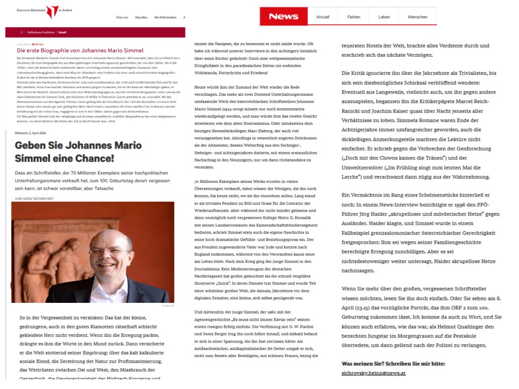 Die Rezension von Alexander Kluy — nun, es reicht vollkommen dieser gegenüberzustellen, um zu wissen, was von dieser zu halten ist, was Heinz Sichrovsky am 3. April zum 100. Geburtstag von Johannes Mario Simmel schreibt.
