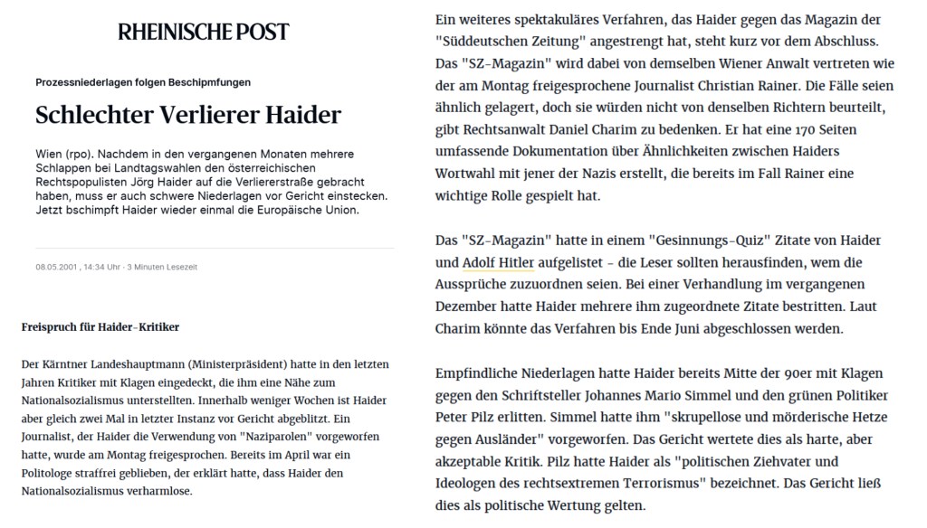 Empfindliche Niederlagen hatte Haider bereits Mitte der 90er mit Klagen gegen den Schriftsteller Johannes Mario Simmel und den grünen Politiker Peter Pilz erlitten. Simmel hatte ihm „skrupellose und mörderische Hetze gegen Ausländer“ vorgeworfen. Das Gericht wertete dies als harte, aber akzeptable Kritik. Pilz hatte Haider als „politischen Ziehvater und Ideologen des rechtsextremen Terrorismus“ bezeichnet. Das Gericht ließ dies als politische Wertung gelten.