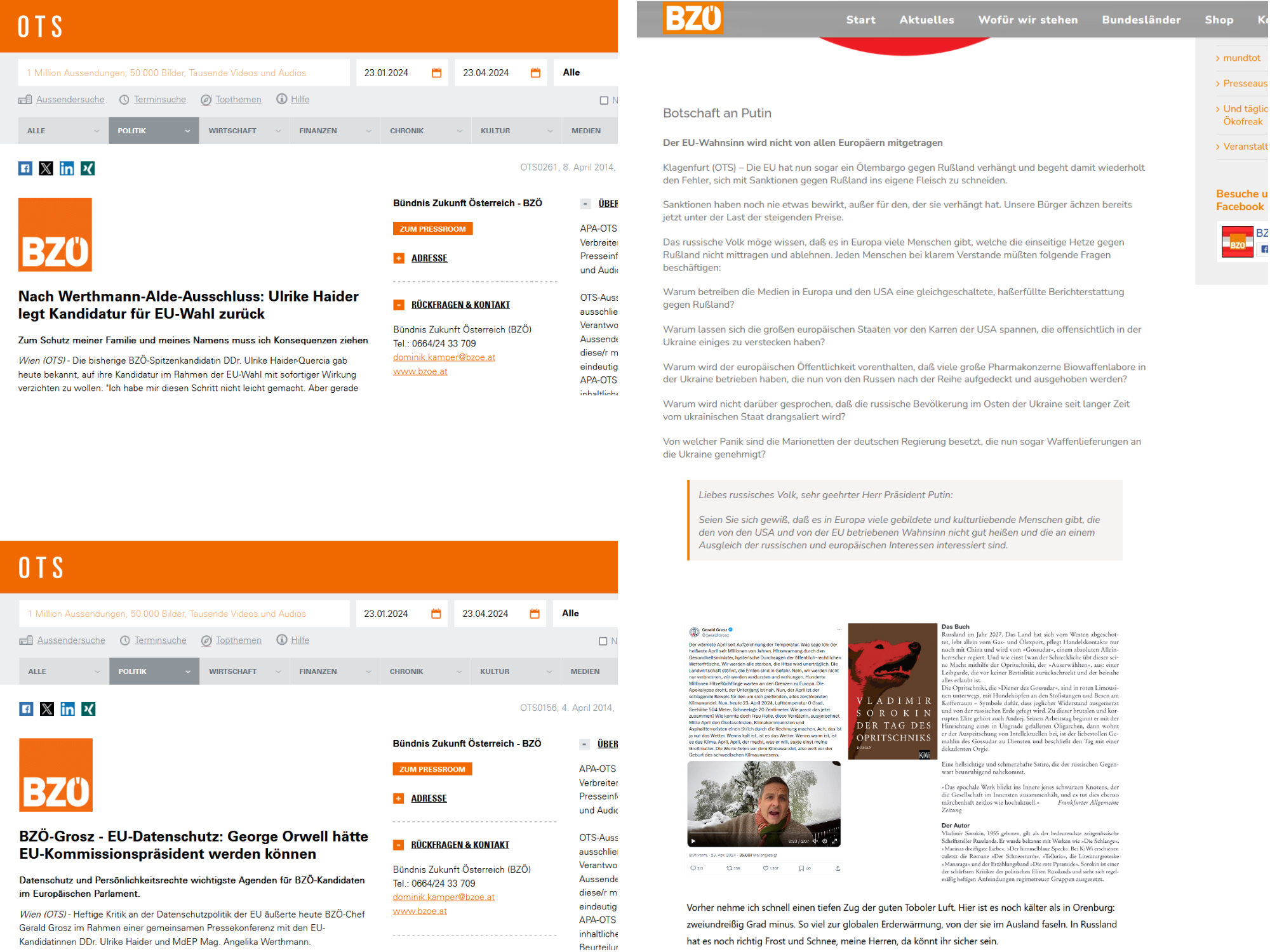 Als Zwetschkenbrocker hegt Gerald Grosz eine nach seiner Herzenswärme mögliche liebevolle Sicht auf das Geschehen in der Wirklichkeit, und wäre er, Gerald Grosz, noch etwas, also „Chef“, dann hätte wohl er diesen Brief nach Moskau der Kleinstpartei unterschrieben, der am 23. April ’24 auf der Website der allein irgendwo in Kärnten noch eine Internetseite betreibenden Partei zu lesen ist: