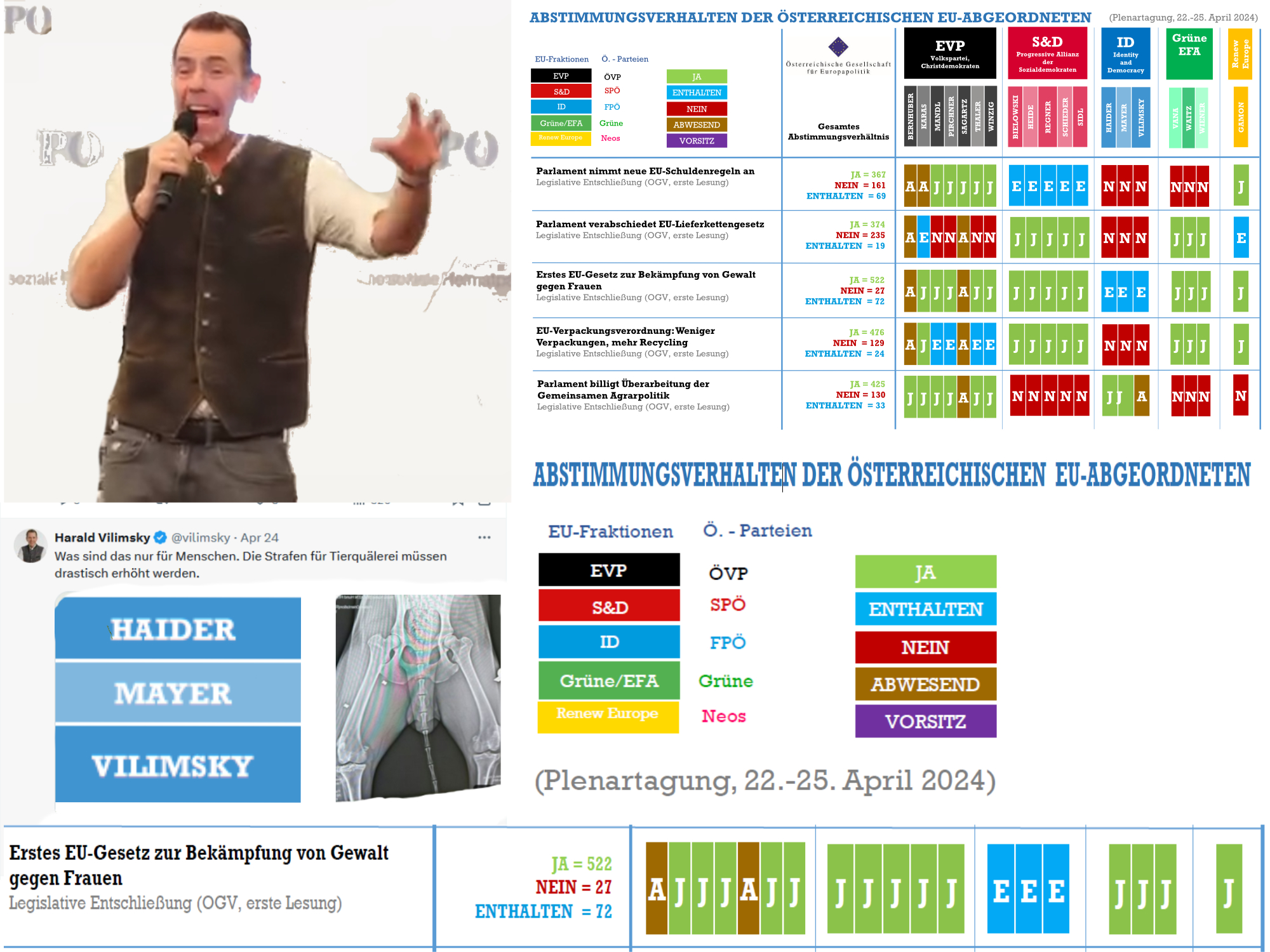 Die Parteibrüder stimmen nicht für die Bekämpfung von Gewalt gegen Frauen, die Parteibrüder stimmen nicht gegen die Bekämpfung von Gewalt gegen Frauen, die Parteibrüder enthalten sich; sich zu enthalten, heißt doch, noch keine Meinung zu einem bestimmten Fall zu haben, die Parteibrüder enthalten sich, geradeso, als hätten sie, die Meinungsreichen, gar keine Meinung zur Gewalt gegen Frauen; aber auch so Meinungsreiche wie die drei Gesinnungsbrüder scheinen nicht davor gefeit zu sein, in ihrem Meinungsreich plötzlich ohne jedwede Meinung dazustehen, allen Meinungen verlustig zu gehen, und ehe es so weit ist, kann Gesinnungsbruder Harald Vilimsky am 24. April 2024, am Tag der Verabschiedung des EU-Gesetzes zur Bekämpfung von Gewalt gegen Frauen, gerade noch eine, seine letzte Meinung vor dem totalen Meinungsausfall aufbringen und absetzen, sein Nein zur Gewalt und sein Ja zur Bekämpfung von Gewalt durch drastisch zu erhöhende Strafen beim Gewalttatbestand Tierquälerei.