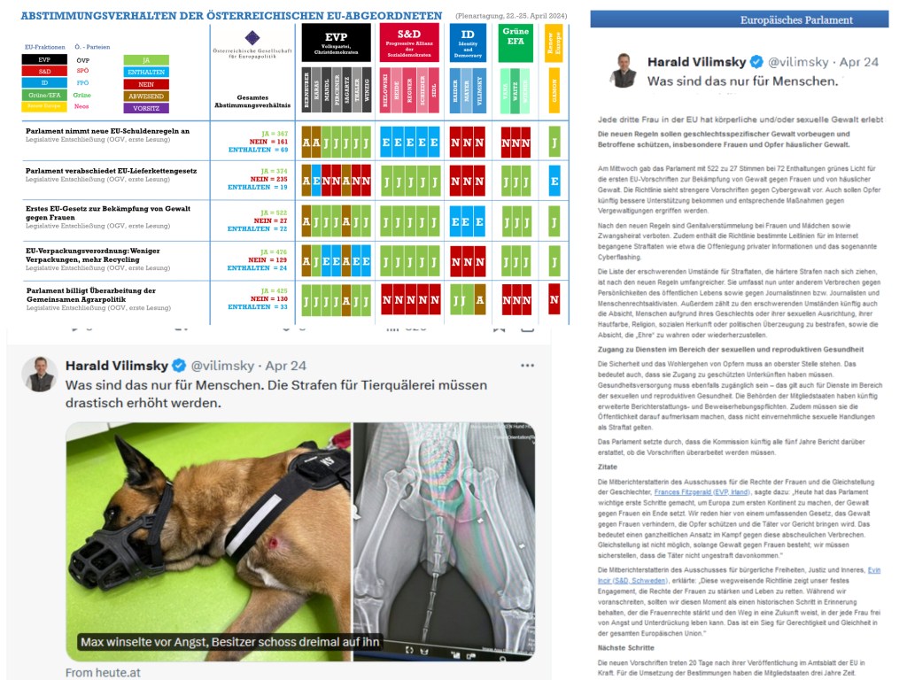 Als am 24. April 2024 über das „erste EU-Gesetz zur Bekämpfung von Gewalt“ abgestimmt wird, enthält sich Harald Vilimsky nicht seiner Stimme, die er noch desselben Tages abgibt – schriftlich auf der Konzernplattform X: „Was sind das nur für Menschen. Die Strafen für Tierquälerei müssen drastisch erhöht werden.“