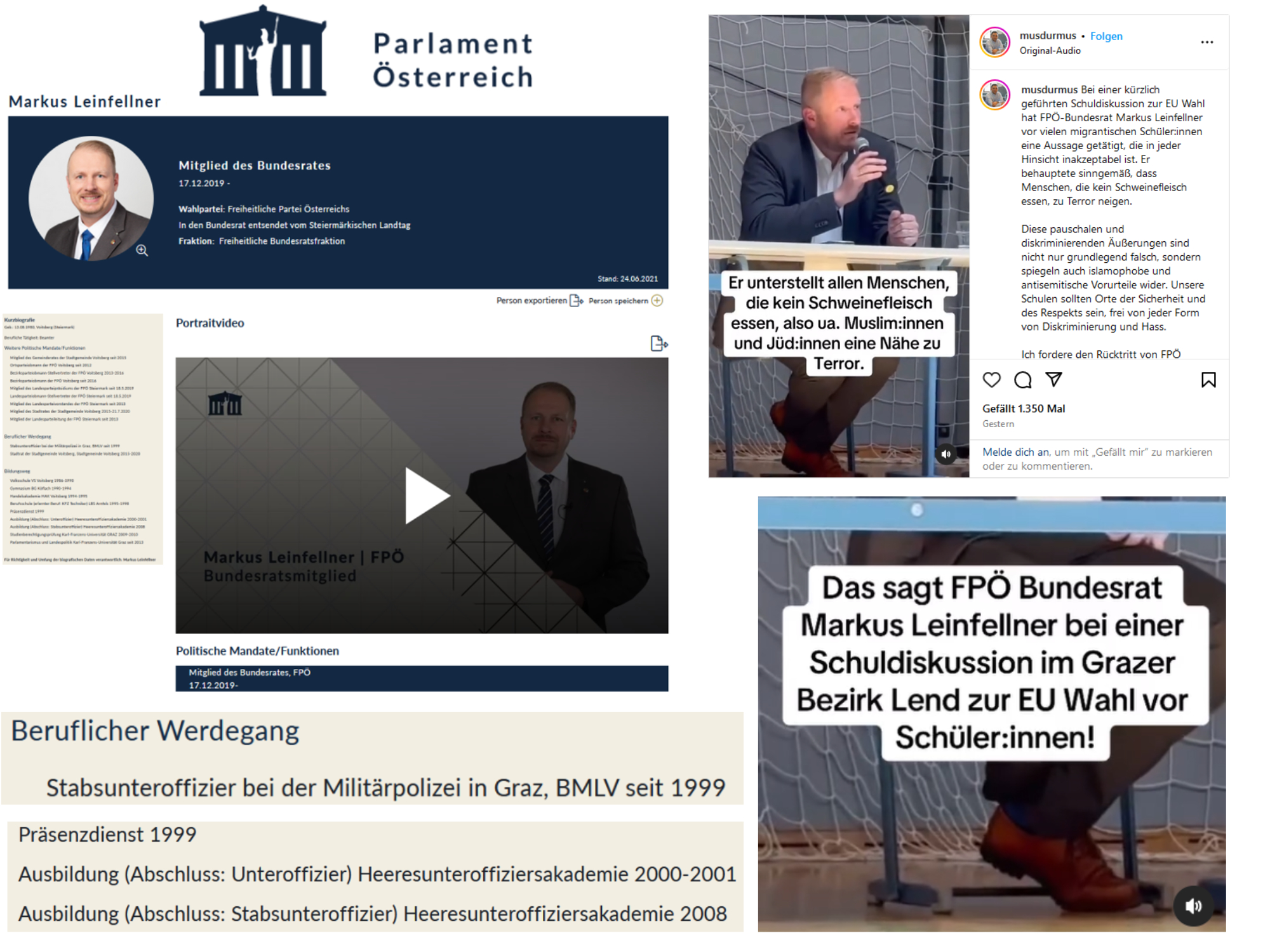 zu jungen Menschen, die in die Schule gehen, soweit der gesamte Mittschnitt des Auftritts des „Stabsunteroffiziers bei der Militärpolizei, BMLV seit 1999“, der auf der Website des österreichischen Parlaments als seinen Bildungsweg auch angibt: „Ausbildung (Abschluss: Unteroffizier) Heeresunteroffiziersakademie 2000-2001, Ausbildung (Abschluss: Stabsunteroffizier) Heeresunteroffiziersakademie 2008“ …