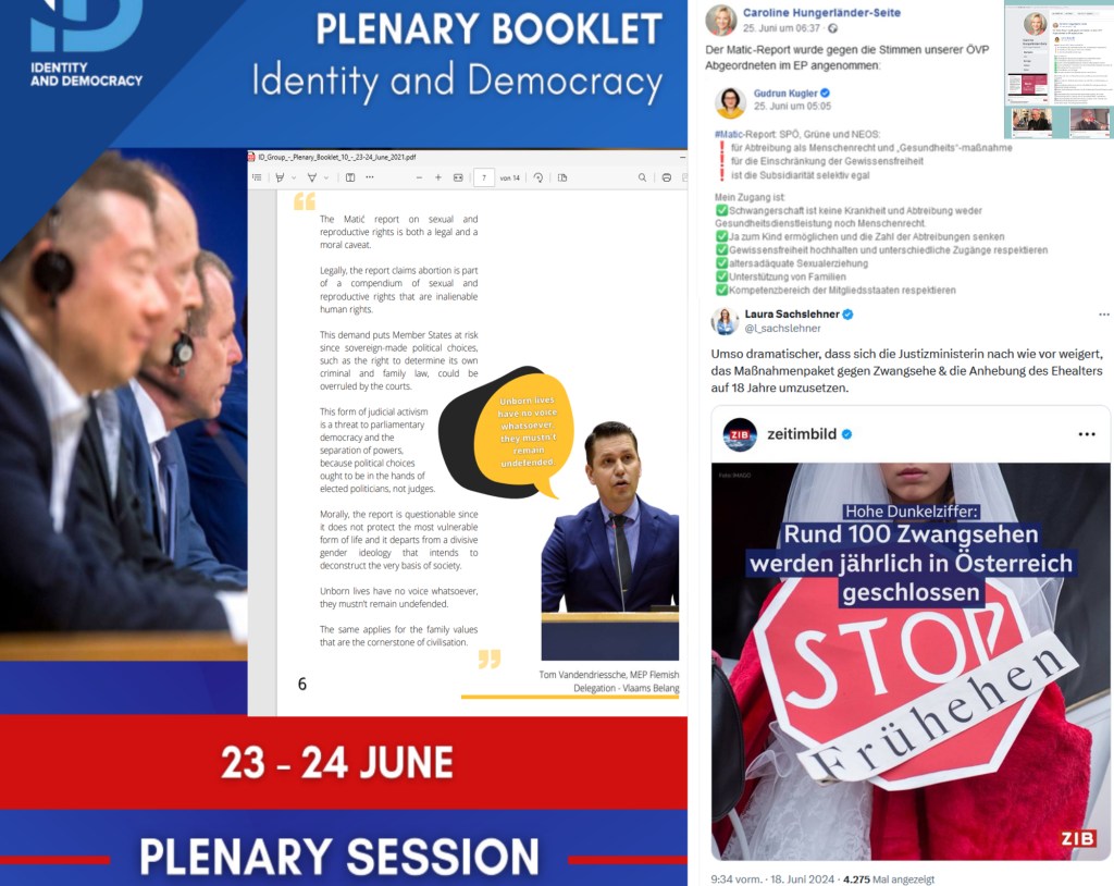 Für die schwarzchristlichen Abgeordneten — gleich auf welcher demokratischer Vertretungsebene: Gemeinderat, Landtag, Nationalrat, Europäisches Parlament –, derart von „Abtreibung“ besessen, daß ihnen der gesamte Matić-Report nur aus diesem einem Wort besteht: „Abtreibung“ … Ihr Dagegensein, ihr stimmen gegen den Matić-Report, mit dem u. v. a. m. gegen „Früh- und Zwangsverheiratung, Kinderehen“ Stellung bezogen wird, ist ein tatsächliches Maßnahmenpaket von internationalem Format zu nennen, während das sachslehnerische „Maßnahmenpaket“ bloßes, einfach wie kurz gesagt, Nationalparteipolitisches …