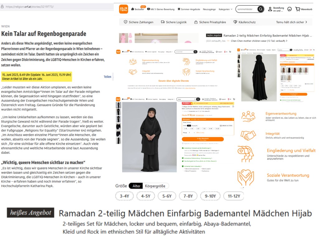 Die Burka, in wie vielen Kapiteln schon kommt dieses Kleidungsstück vor, es will nicht gezählt werden, nie aber auf eine verteidigende oder gar verherrlichende Art, wie es eben in einem Roman zu sein hat, es wird erzählt, eines aber ist doch zur Vollverschleierung erzählend hinzuzufügen, wenn Mädchen auch auf den Straßen Wiens gesehen werden, die keine zehn Jahre alt sind, die keine neun Jahre, keine acht Jahre alt sind, derart angezogen, nicht selten ganz in schwarz, hingegen für Frauen nach ihrer Menopause es kein Vergehen mehr sei, wenn sie ihre Kleider, also diese Verschleierung ablegen, was kann daraus geschlossen werden? Daß minderjährige Mädchen den Männern schon Sexualobjekte, ihre Kleidung ihnen ein Code de sexe? „Heißes Angebot Ramadan 2-teilig Mädchen Einfarbig Bademantel Mädchen Hijab & Langarm“ ist auf „Temu“ zu lesen, an diesem 22. Juni 2024 … „Heißes Angebot“ —