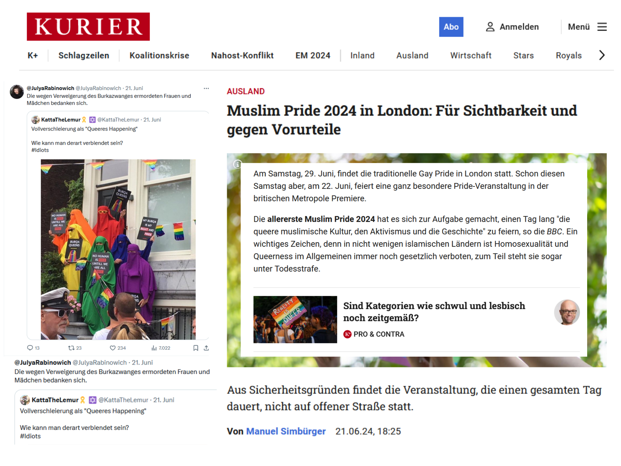mit einem Bild bekräftigt, das nichts mit der „Muslim Pride“ in London zu tun hat, es ist ein fünf Jahre altes Bild, aufgenommen auf der Pride in Amsterdam, es zeigt Frauen in Burkas in the colors of the pride flag, sie halten Tafeln mit Losungen, wie „No human is free until we are all free“, wie „My burqa is my right and pride“ … Dafür hatten sie, vor fünf Jahren, ob gerechtfertigt oder nicht, jedenfalls für sie selbst einen vor und für sich gerechtfertigten Anlaß … Nun, einen Tag vor der „Muslim Pride“ in London dieses Burkabild zu bringen, dieses Burkabild mit diesem Text über die „Verweigerung des Burkazwanges“ weiterzuverbreiten, verstehe, wer kann … In London wird an diesem Samstag, 22. Juni 2024, es offener, breiter diskutiert werden, wie das Programm vermuten läßt, nicht reduziert auf Sprüche auf der Konzernplattform X …