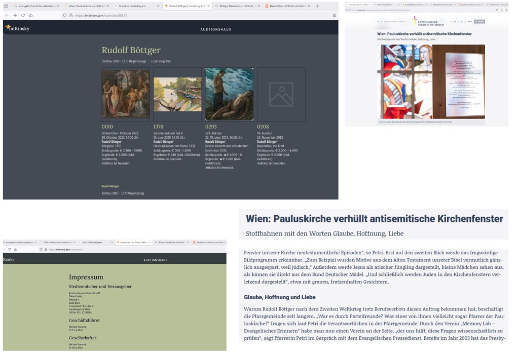 Ein Verschweigen gibt es für das Aktionshaus im Kinsky ebenfalls nicht, die Bilder von Rudolf Böttger versteigert. Viel bringen seine Bilder nicht ein, ein billiger Maler, leistbar auch für jene, die gesinnungsgemäß ihr Heim, das ihnen ihre Festung ist, mit einem böttgerischen Original heimelig … Das Aktionshaus im Kinsky verschweigt nichts, ist am 5. Juli 2024 zu lesen: „(Tachau 1887 – 1973 Regensburg) » Zur Biografie“ — So offen weist das Aktionshaus im Kinsky auf die Biographie von Rudolf Böttger hin, und wer „Zur Biographie“ anklickt, bekommt die ganze böttgerischen Biographie unverschwiegen: „Rudolf Böttger Tachau 1887 – 1973 Regensburg“ …