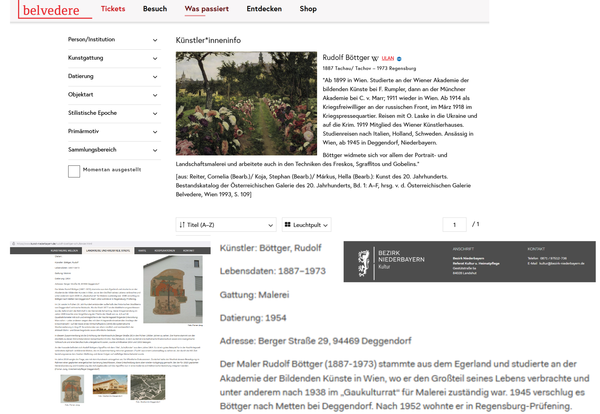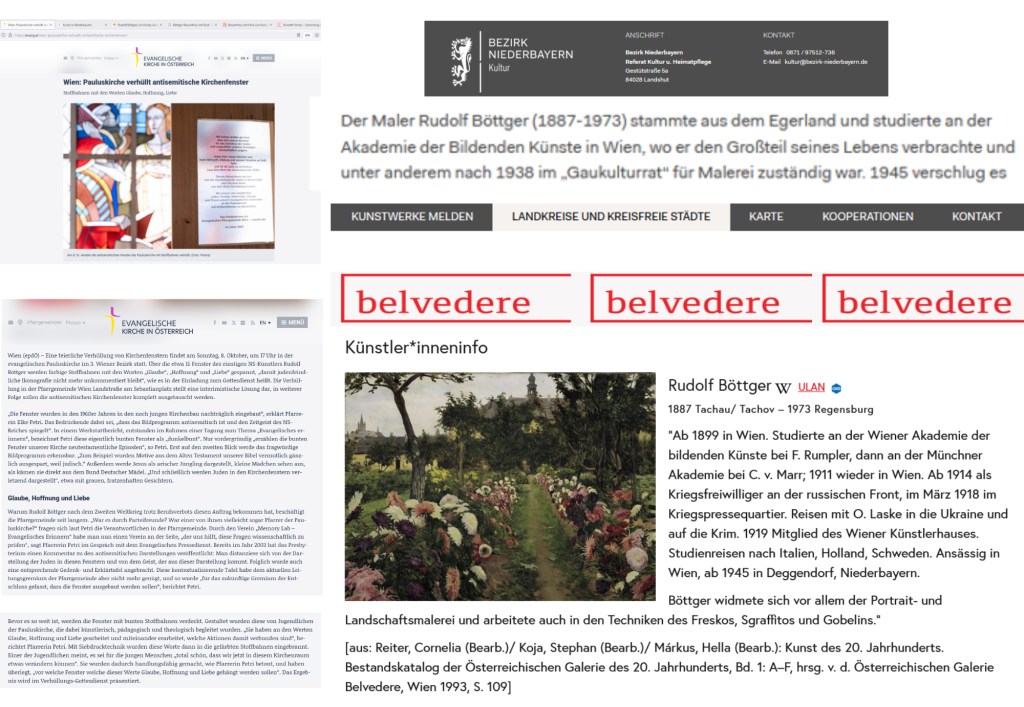Die österreichische Galerie Belvedere zeigt in ihrer Online-Sammlung, gesehen am 5. Juli 2024, ein gar schönes Bild von Rudolf Böttger: „Klostergarten in Tachau“, und selbstverständlich verschweigt „Das Belvedere – ein Museum von Weltrang, Vermittler von Geschichte und Schauplatz zeitgenössischer Kunst, Barockjuwel, digitaler Player und ökologisch bewusst: a museum that matters. Erfahren Sie hier, wofür das Museum steht.“ nicht die Biographie des Rudolf Böttger: