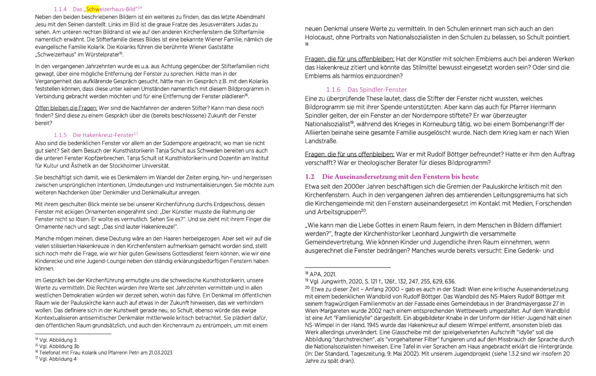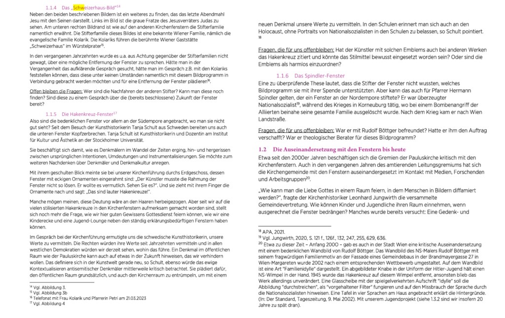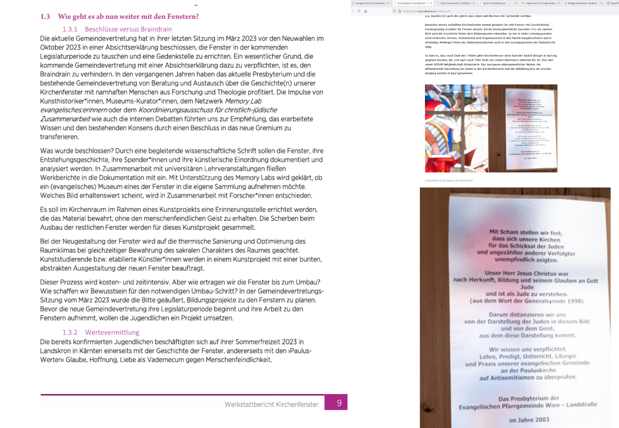 In der Öffentlichkeit wird intensiv über problematische Denkmäler und Bildwerke diskutiert. Ein prominentes Beispiel ist das Lueger-Denkmal am Wiener Stuben-Ring, das in den dritten Wiener Gemeindebezirk blickt, wo auch die Evangelische Pauluskirche steht. Anders als das Lueger-Denkmal, das „nur“ einen antisemitischen Bürgermeister Wiens zeigt, der die Bevölkerung aufwiegelte, zeigen die Fenster der Pauluskirche selbst ein antisemitisches Bildprogramm. Die Pauluskirche mit ihrer antisemitischen Ikonografie ist somit ein evangelisches Beispiel für problematische Denkmäler im öffentlichen Raum, das bereits seit Anfang der 2000er Jahre immer wieder diskutiert wird. Der vorliegende Beitrag ist im Rahmen der Tagung „Evangelisches Erinnern. Evangelische Erinnerungskulturen im Österreich des 20. und 21. Jahrhunderts“ im April 2023 entstanden und versteht sich als Werkstattbericht einer Kirchengemeinde.
