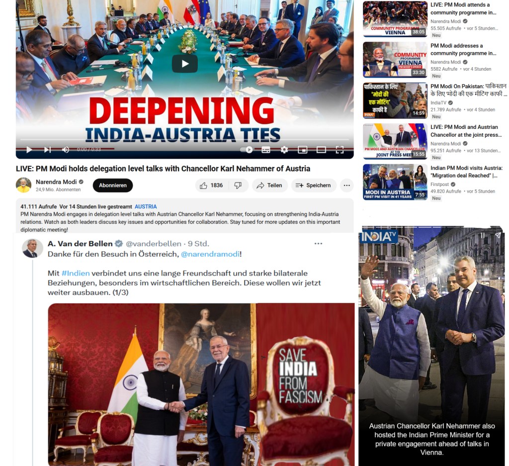 So war Modis Besuch in Moskau über weite Strecken mehr freundschaftlicher Akt als mahnender Appell. Die beiden Staatschefs zeigten sich vertraut, tauschten beim gemeinsamen Tee Nettigkeiten aus. Wie es bei „wahren Freunden“ üblich sei, hätten sie zusammengesessen und sich „über eine Reihe von Themen unterhalten“, sagte Modi nach seinem Besuch. Er sei „glücklich“, dass „wir beide unsere Ansichten bezüglich der Ukraine offen und detailliert darlegen konnten“. WIEN. Beim Besuch des indischen Premiers Narendra Modi am Mittwoch in Wien haben Bundeskanzler Karl Nehammer (ÖVP) und sein Gast Indien und Österreich als „Brückenbauer“ auf dem Weg zu einer Beendigung von Russlands Ukraine-Krieg positioniert. Der seit zehn Jahren im Amt befindliche Hindu-Nationalist Modi war am Dienstagabend, aus Moskau kommend, auf dem Flughafen Wien-Schwechat gelandet. Gleich danach traf der 73-Jährige Nehammer bereits zu einem Abendessen samt Vier-Augen-Gespräch. Modi bezeichnete Putin am Dienstag als „lieben Freund“.